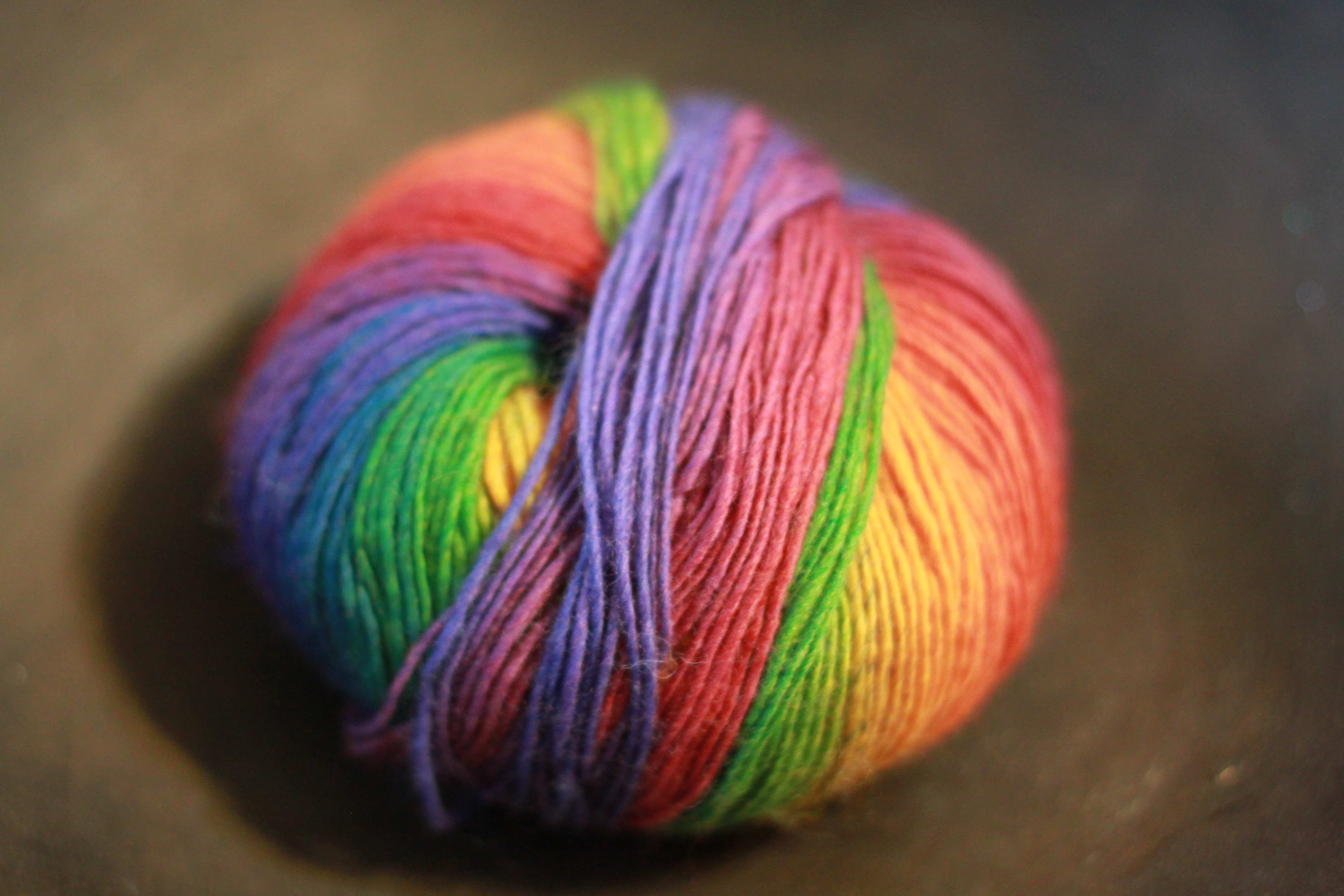 I’m Bonny, and I knit. I crochet too, but mostly knit, and besides, most people look at crochet and say “Ooh, what are you knitting?” So, I knit. I’m also a stay-at-home mom of two kids who are active and smart and delightful and also kids so they’re challenging. So, I knit. It makes me happy. A few days ago, I fell in love. Hard. So hard I saw rainbows. No, not with my husband–that happened many moons ago. This was yarn. I was out with my sister-in-law and my daughter at a local yarn store (LYS) http://www.thestudiokc.com/ and this little ball caught my eye. It wasn’t just any yarn, but rainbow yarn. (I feel like it deserves a special name, something more poetic than just “yarn”.)