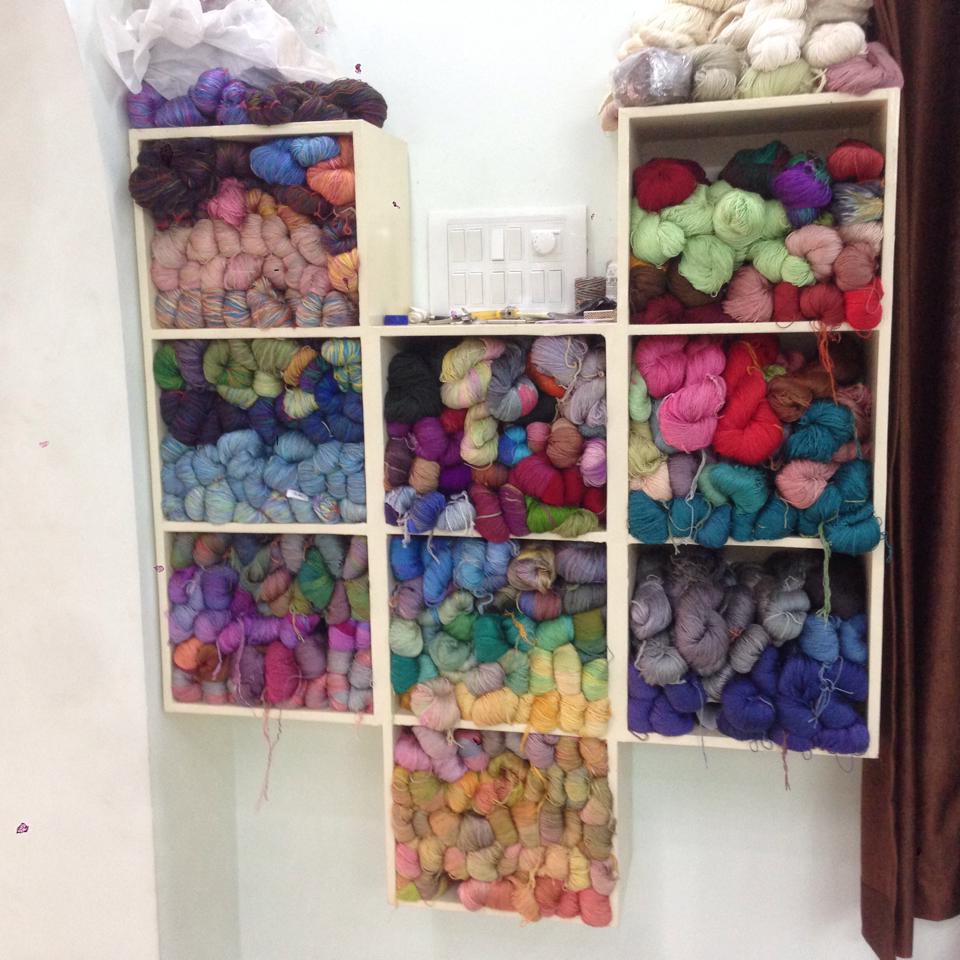 That’s right, my fabulous husband found a company in Bangalore called Silkindian that creates specialty, luxury silk products, including handpainted, handspun yarns. (They also have machine spun yarn, custom yarns, fiber for your own spinning pleasure, silk fabrics and knitting needles.) Not only that, he convinced his driver to go out of their way to find this place so he could buy me yarn. That was difficult since apparently not many women in Bangalore knit for fun and the driver couldn’t figure out why Alex would want to go to this place.