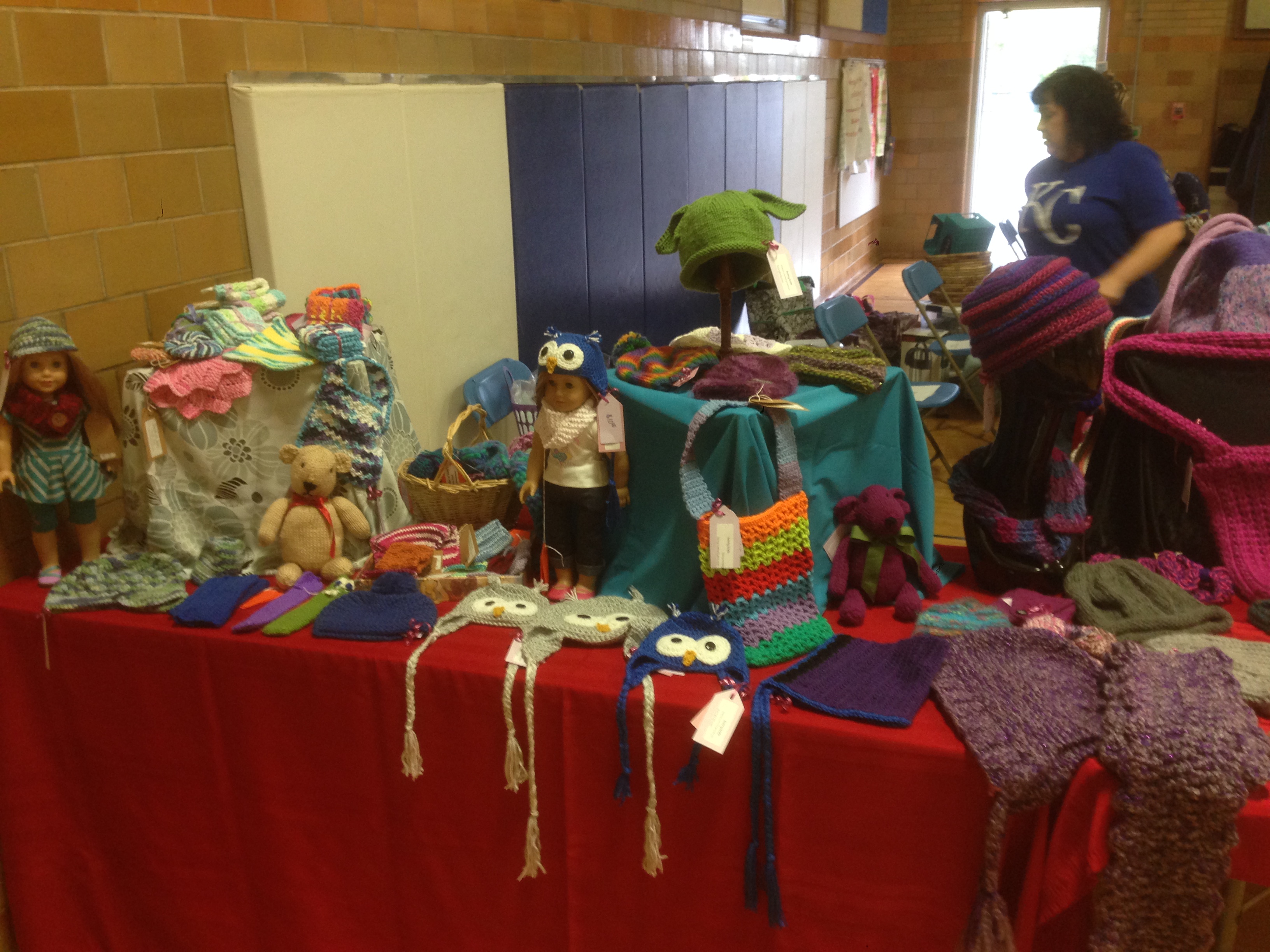 I sold the blue/green newsboy caps, a set for girl and doll. I sold my purple faux fur cowl (kinda sad about that one). I sold a $30 Brio cowl to a woman for her 5yo daughter (yikes. I cringed thinking about what would happen to my gorgeous cowl). I sold a gray slouchy hat and the gray crochet newsboy. At the very last minute I sold my purl ridge cowl, the one made with vintage Malabrigo in gorgeous shades of purple and blue. That one was hard. I kind of wish I’d kept it. But it went to my MIL, so at least I’ll get to see it sometimes.