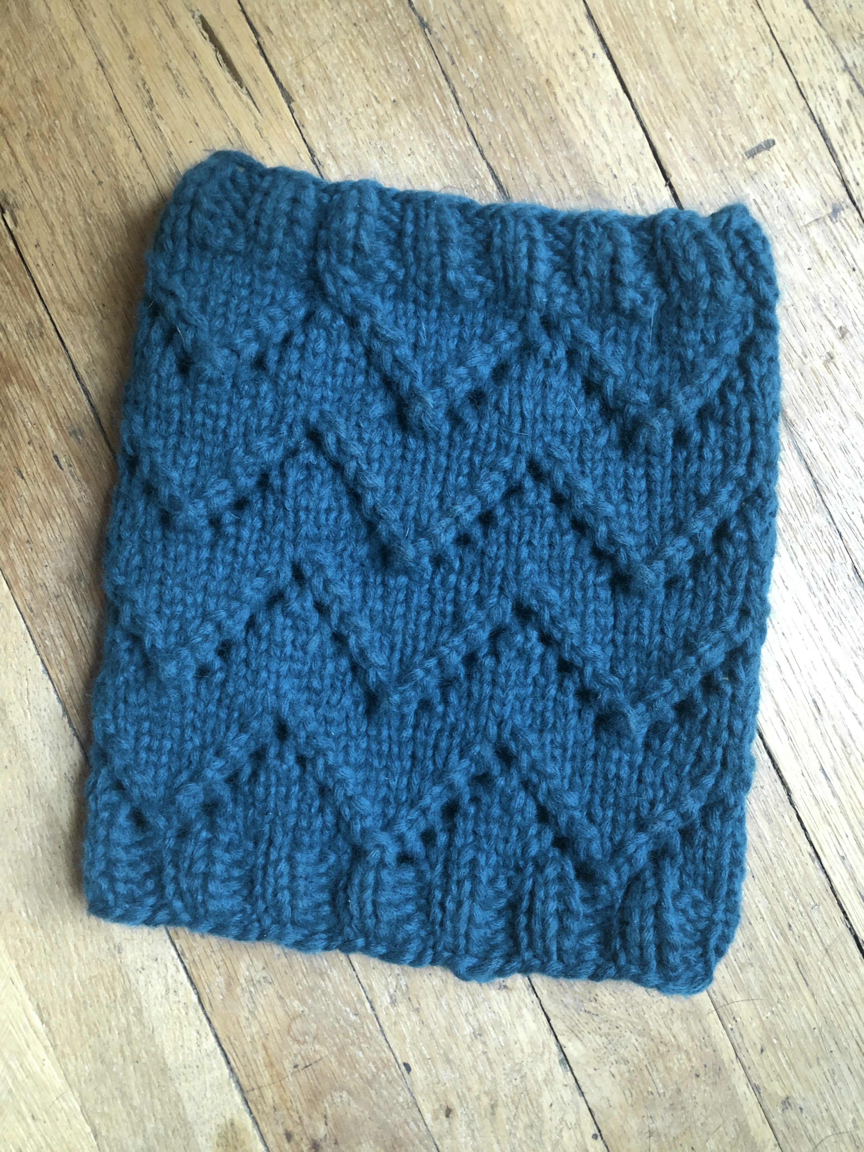 The yarn is Beatrix from Juniper Moon and it’s like a cloud, it’s so light and airy. My LYS had a sweater on display, and as much I’d love one myself, I need to test the yarn and make sure it’s not itchy, since it’s 30% angora. Not sure what I’ll do with the cowl if it is itchy, but that’s a problem for future Bonny. The pattern is River Deep, Mountain High, a free pattern from MollyGirl Yarn. It’s one of my absolute favorite patterns. I’ve lost count of how many I’ve made.