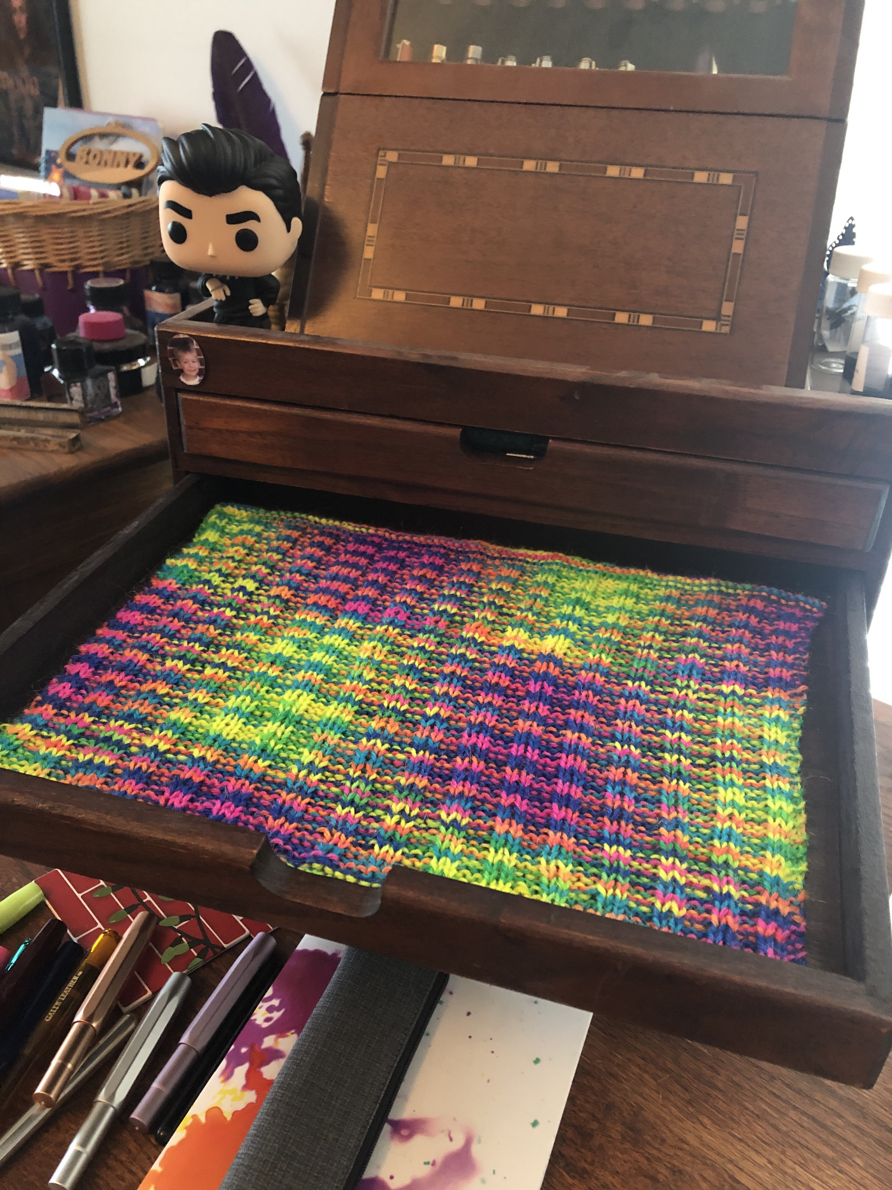 These are awesome – would never have thought about knitting drawer liners. As a fountain pen addict I also love your pen collection – that chest is super cute!