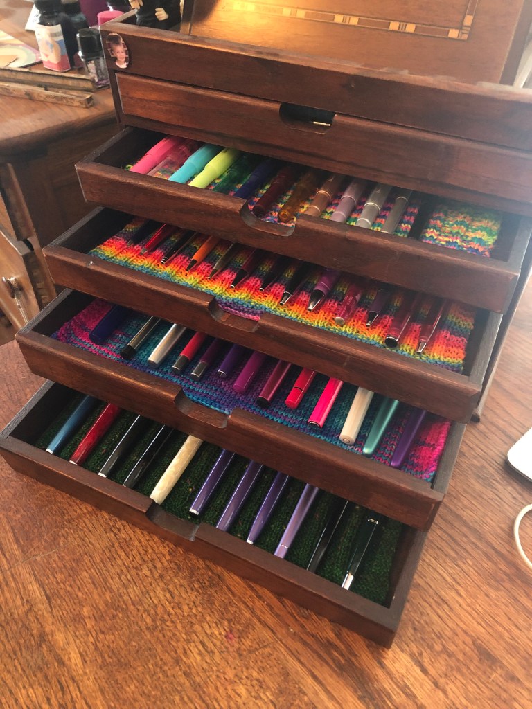 Thank you! It’s from an antique store and originally I thought it would hold knitting needles, but it’s so much more fun as a pen chest!