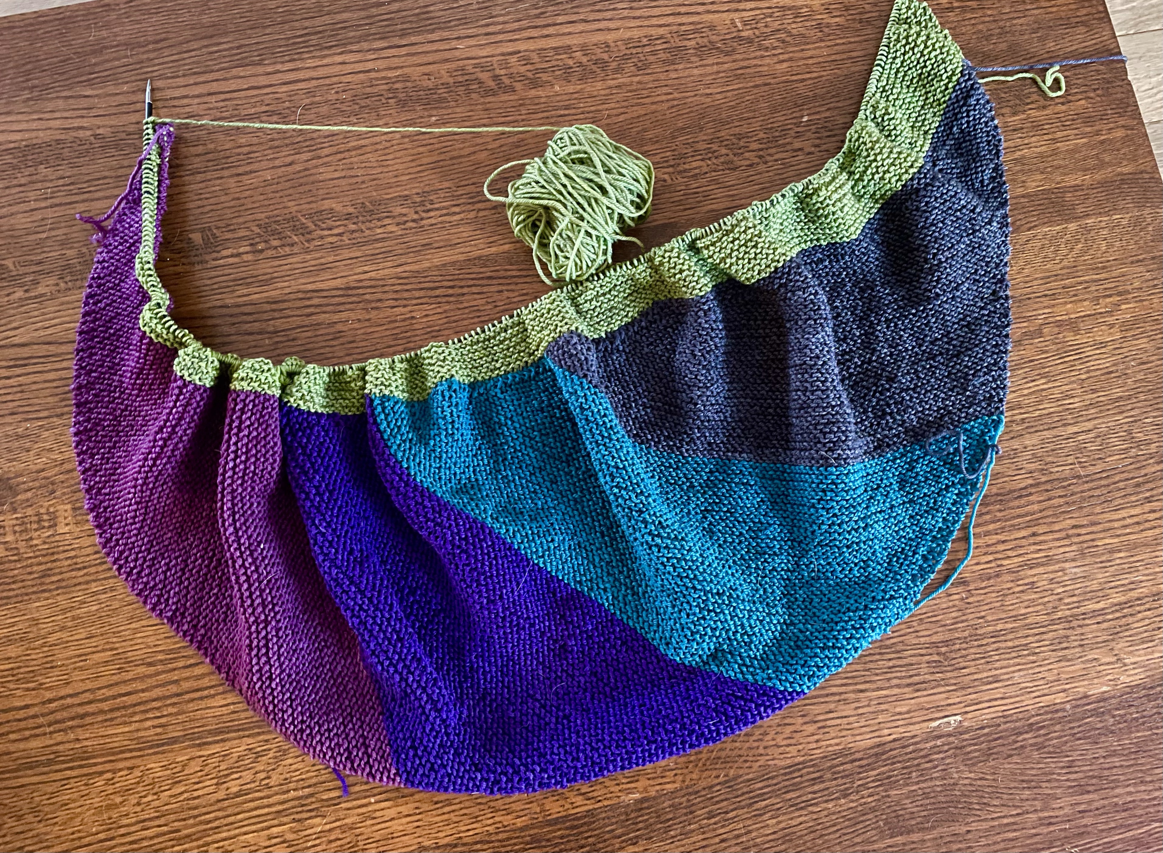 1. Plain ribbing can take forever. Once I get in a groove, I’m fine, but in the early stages it seems to move so slowly. I love the colors of your wrap. Screw the green! Rip back, bind off and wear it with pride.