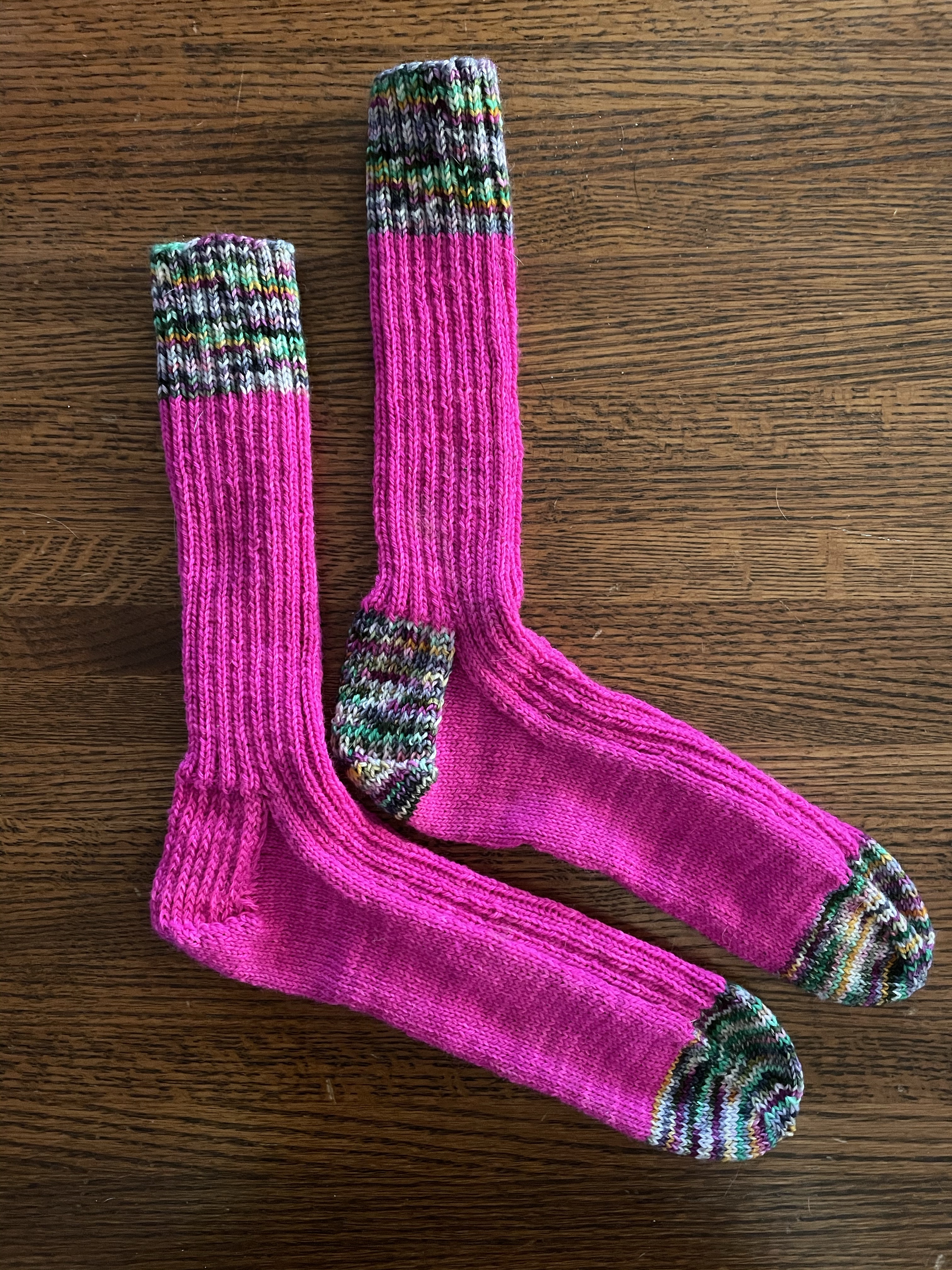 The first thing you may notice is that one heel is solid pink. That’s the annoying thing about this sock. See, I had a 20g ball of that contrast yarn but once I got past the second cuff, I only had 5.5 grams left and I wasn’t convinced that was enough for a heel and a toe, and I wanted a contrast toe more, so I went the safe route. Of course then I got done and I’m pretty sure I could have done the heel too. Next time I do contrasts, I think I will weigh as I go so I know how much yarn each little contrast element takes.