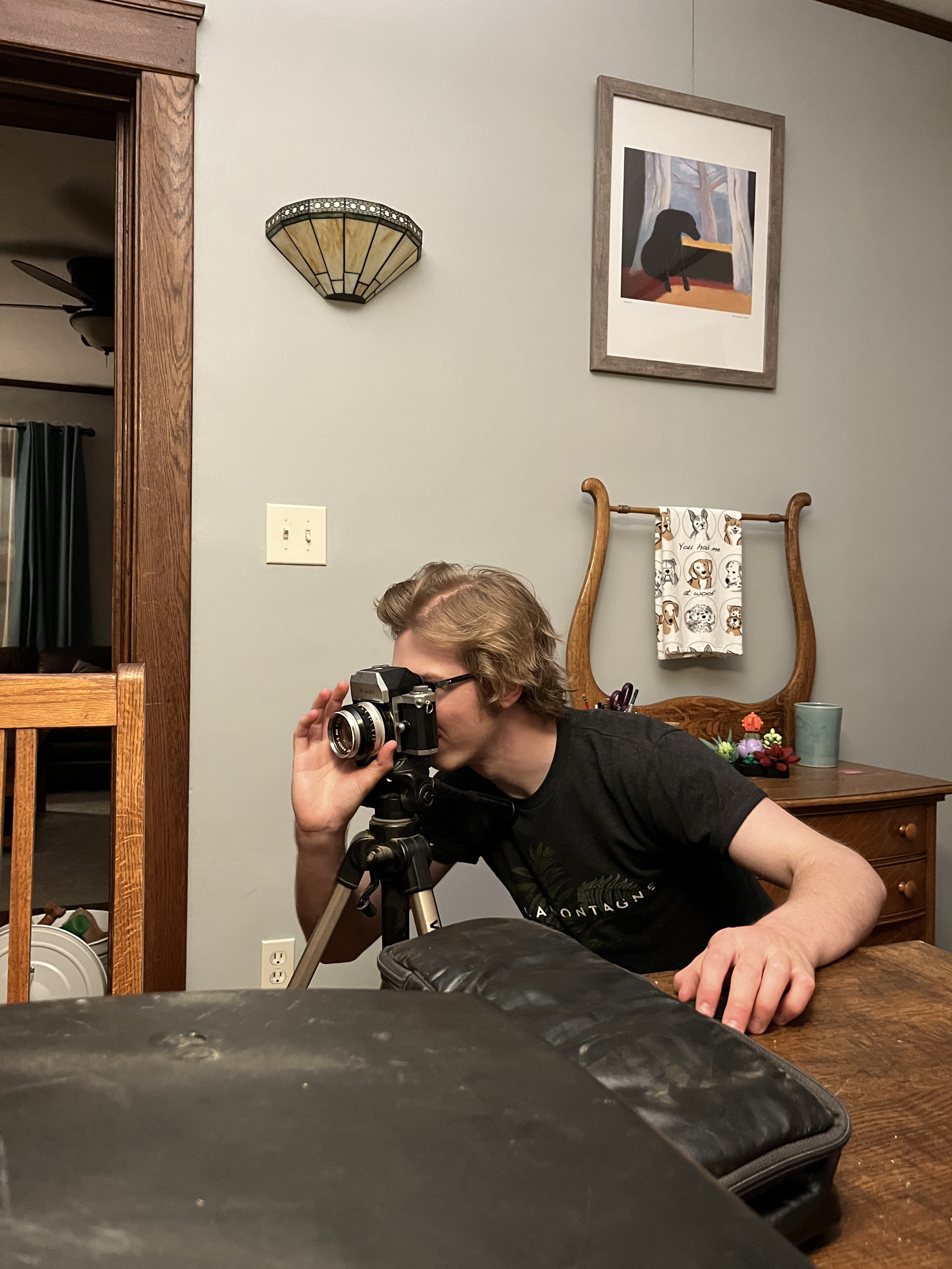 You probably know where this is going. Last night he came for dinner and after dinner I brought down the case so he could see my dad’s camera and equipment. We were all amazed at how well-maintained it all was, given that it was probably from the early 1960s. But that was my dad — he believed in taking good care of your things. We all had a great time poking through all the accessories and smelling the leather (that was mostly me) and trying to figure out how the camera worked. I even found a few rolls of film — we’re hoping those aren’t as old as the camera! He got one loaded into the camera and took a few shots.