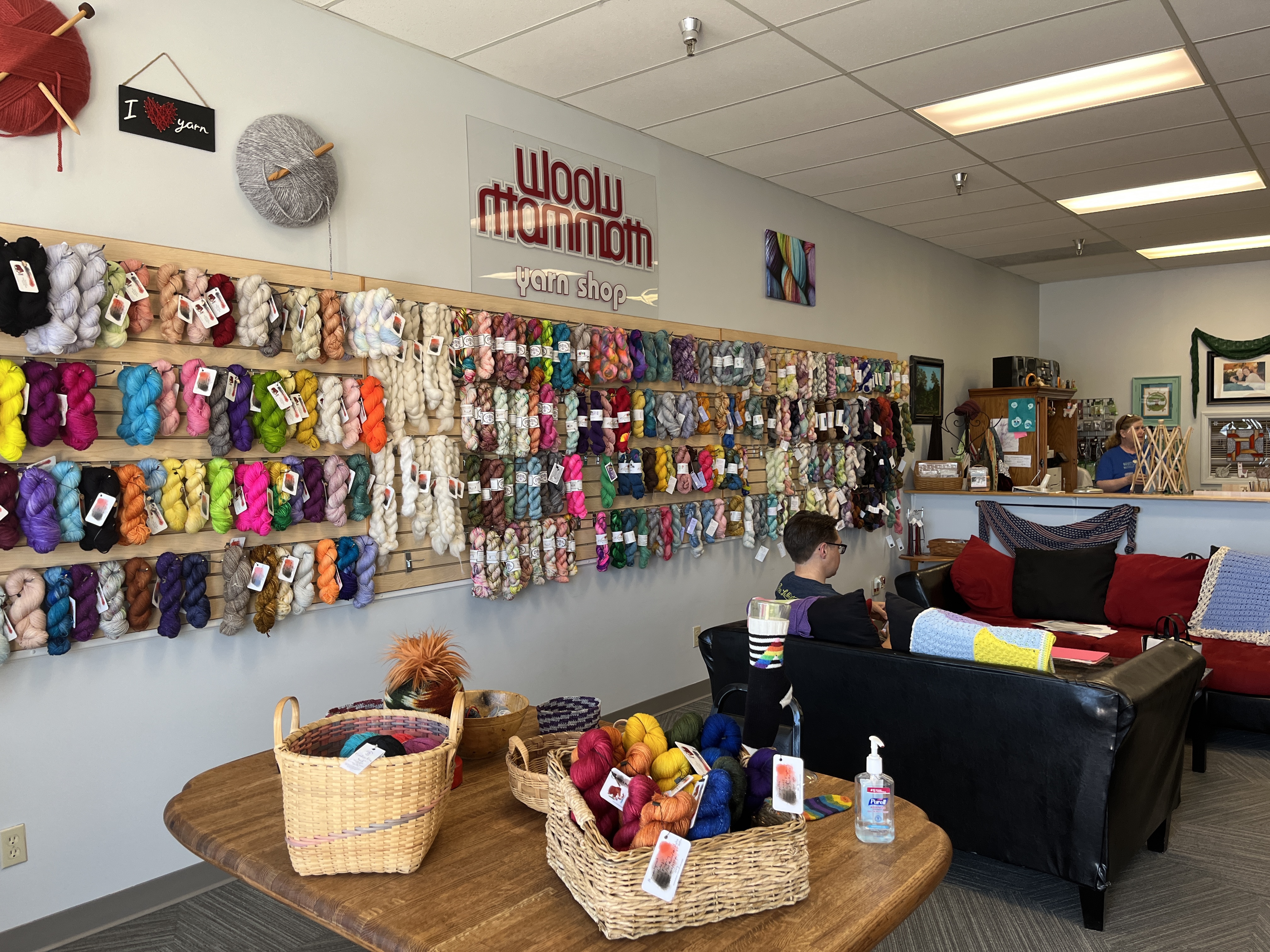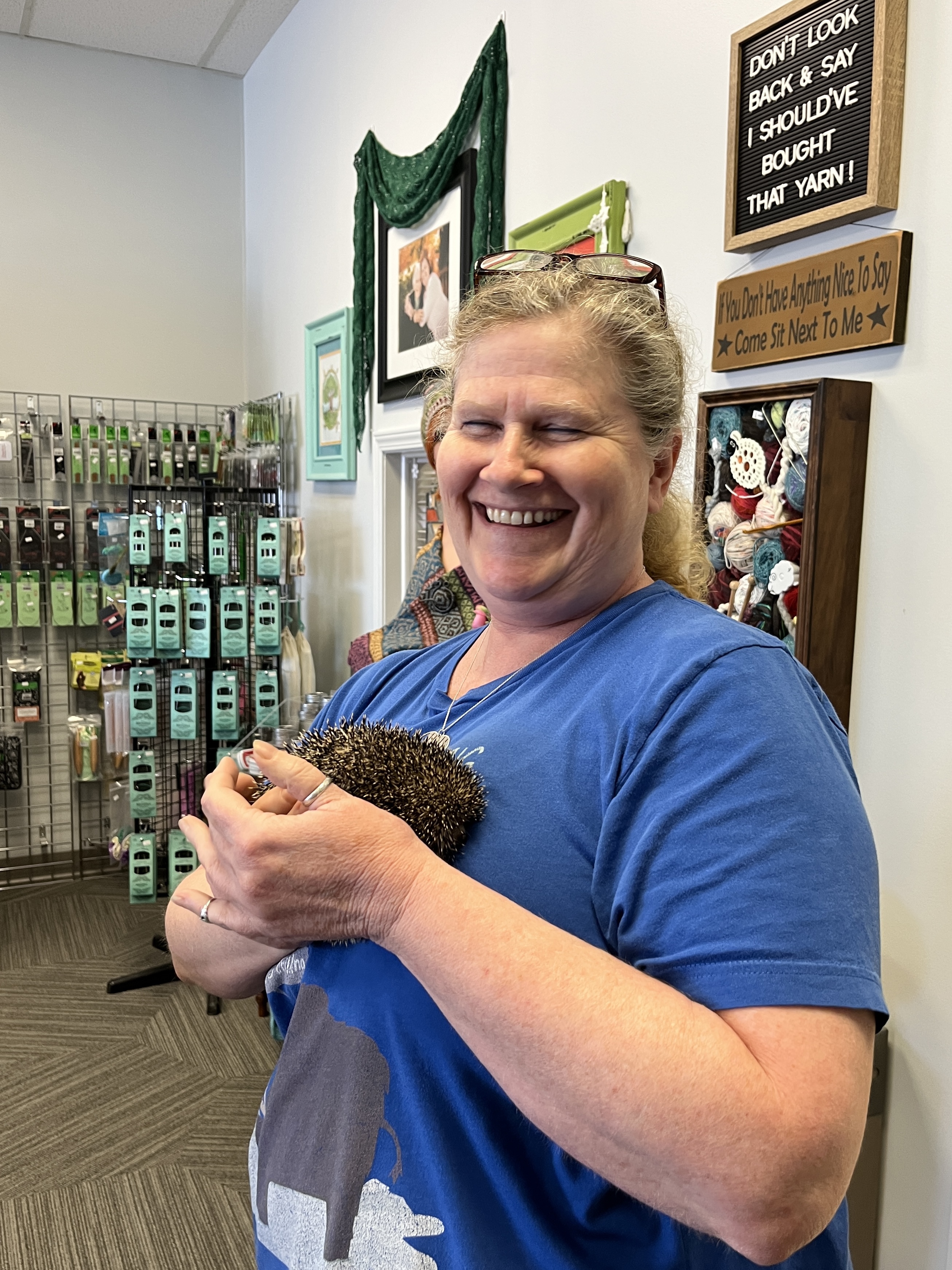 My favorite yarn store was Wooly Mammoth in Omaha. She dyes yarn herself, lots of gorgeous rich solids and tonals, plus she carries indie dyers like A Whimsical Wood Yarn Co. and Cornbread and Honey. PLUS! She has a HEDGEHOG. Yes, a real live hedgehog, named Hank, and I got to meet him and pet him! He was prickly (shocker, I know). She offered to let me hold him but I was afraid I’d drop him.