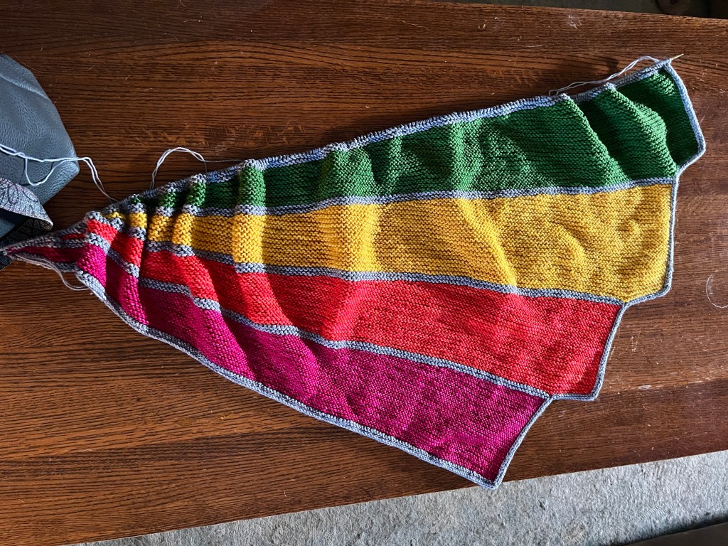 Only two colors left and I can’t imagine they’ll take too long. It’s not exactly the stashbuster I’d planned, since I ended up buying three of the seven colors, but it cleared out four skeins and I sure love it. It’s going to be HUGE and squishy and cozy!