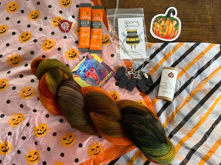 But there was more in the box! An adorable pumpkin sticker, a stitch marker necklace with sparkly coffin stitch markers dangling from a half-moon (from Gloomy Erina) , some pumpkin spice coffee, and a pumpkin spice latte lip balm which has a subtle fragrance and feels really nice.