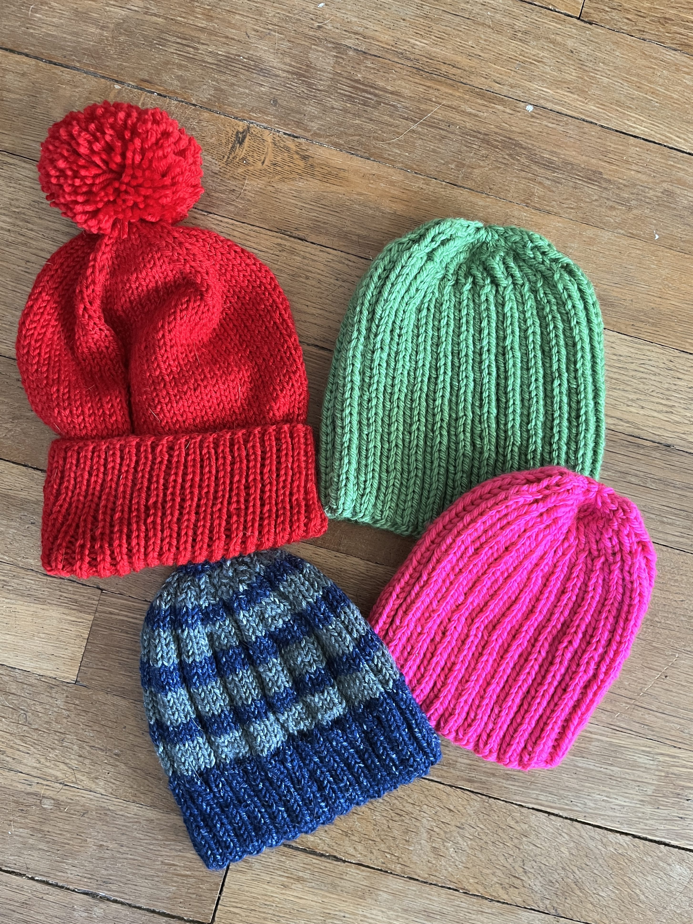 I guess you’ll only see me when I’ve managed to finish something. At least that’s the current trend. There’s a group at work collecting winter gear for kids, and I’ve got four hats done and ready to donate. Okay, almost. They’ve been washed but there’s still a bit of stray dog hair, so I need to use the lint roller on them before bagging them up. It was fun to have an excuse to make some hats and it used up four skeins of acrylic from my stash.