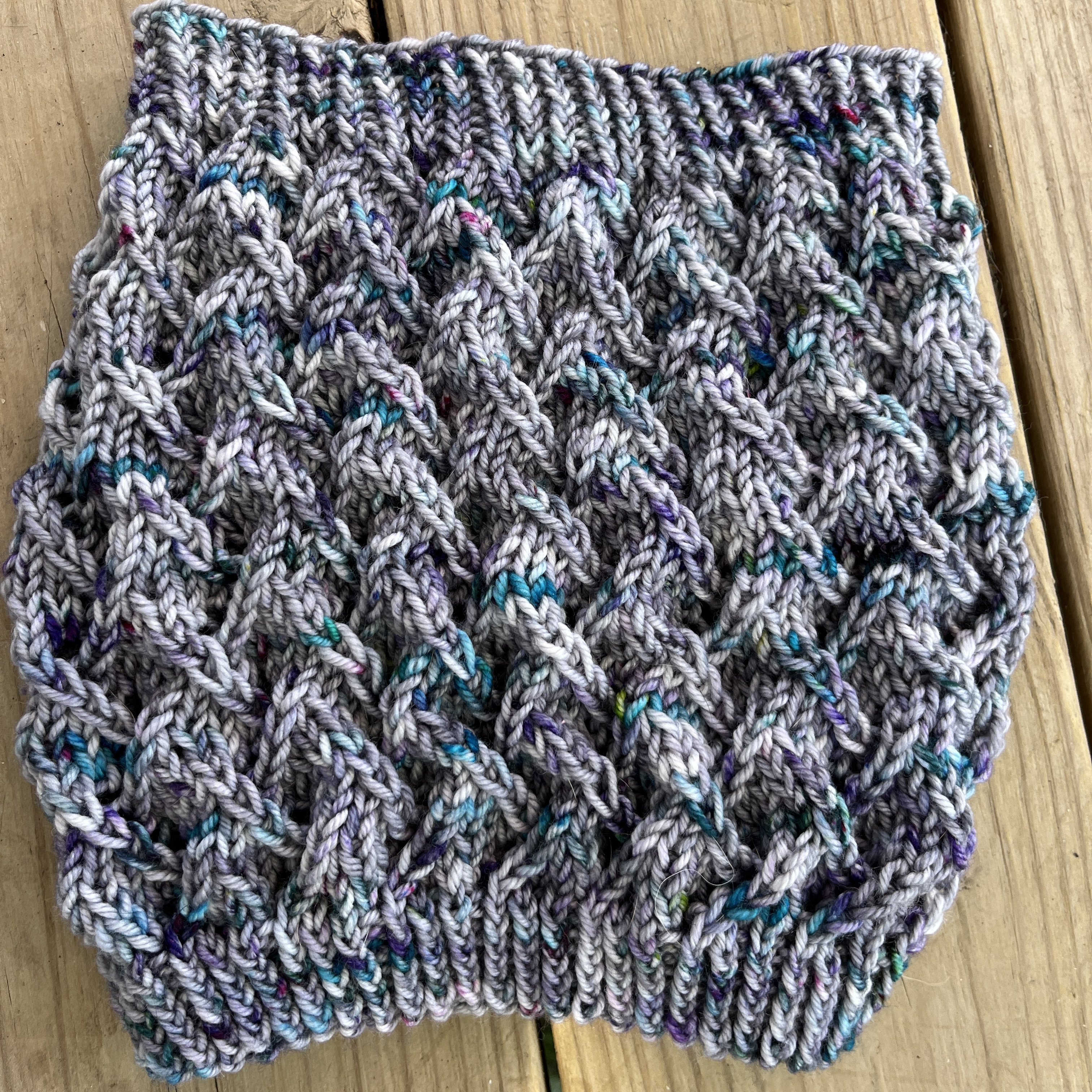 It’s written for DK weight with simple lace. I loved knitting it and really wish I’d been smarter when I cast on and weighed how much each pattern repeat used. I’m pretty sure I ended up with enough yarn to do another repeat. So if you knit one, weigh your yarn after the ribbing and then again after you do the first repeat. That way you’ll be able to check before you start the second round of ribbing and use up as much yarn as you can! Oh, and my yarn is Old Rusted Chair Squish DK in Oil Slick, and I love it so much. It’s hard to see but there are little bits of turquoise and purple in there.