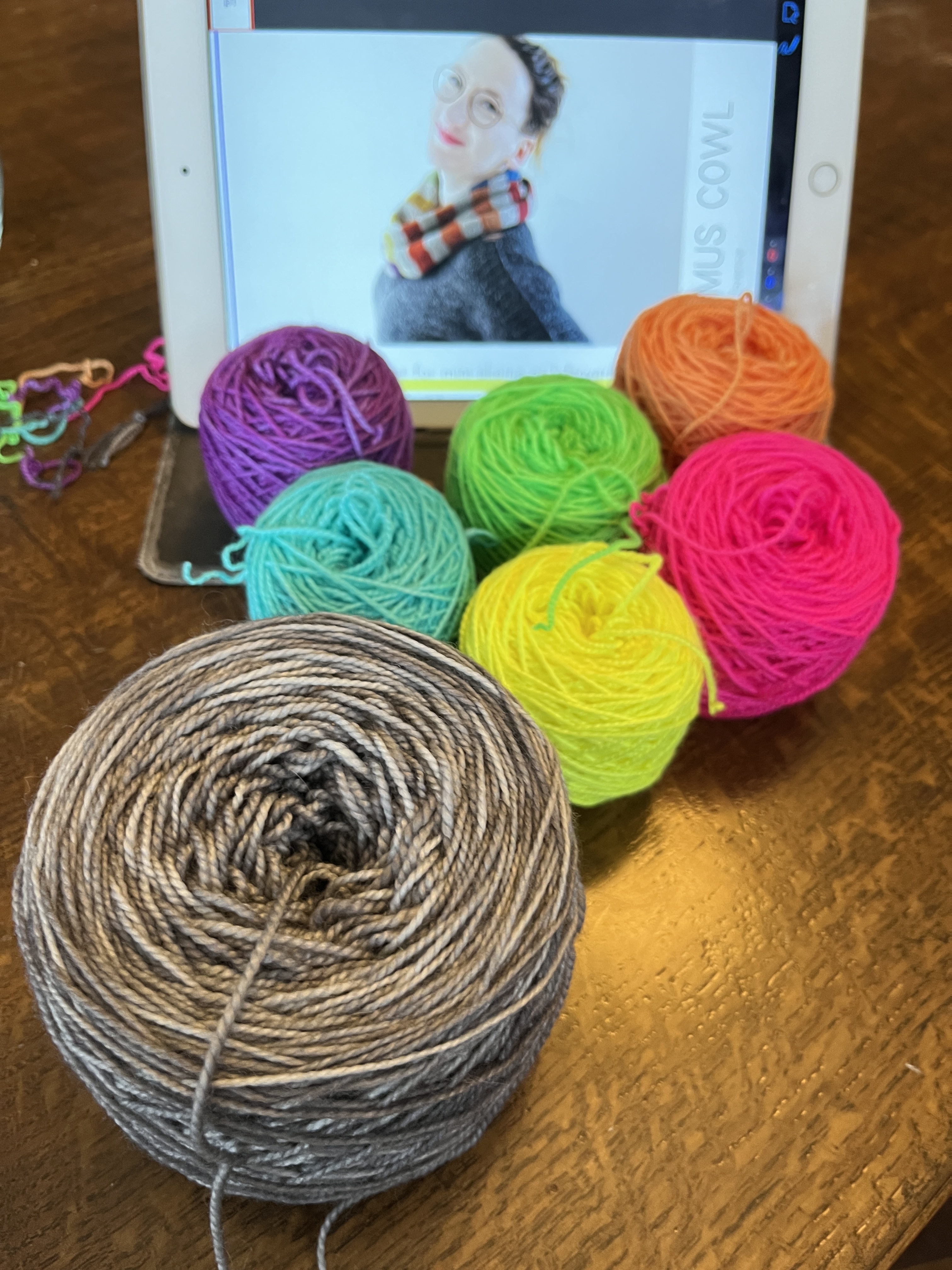 We had tickets to the symphony Saturday night and I needed a mindless knitting project. The Litmus Cowl has been on my queue for ages so I downloaded the pattern (free on Rav, can’t find it elsewhere), pulled out a skein of gray and a set of six mini skeins from Show Me Yarn (from DEEP stash), and got to winding. I even split each mini skein into four tiny 5g balls, to make for the most mindless of mindless knitting. I did my provisional cast-on, joined, and knit three rounds before putting it away into its bag for the evening.