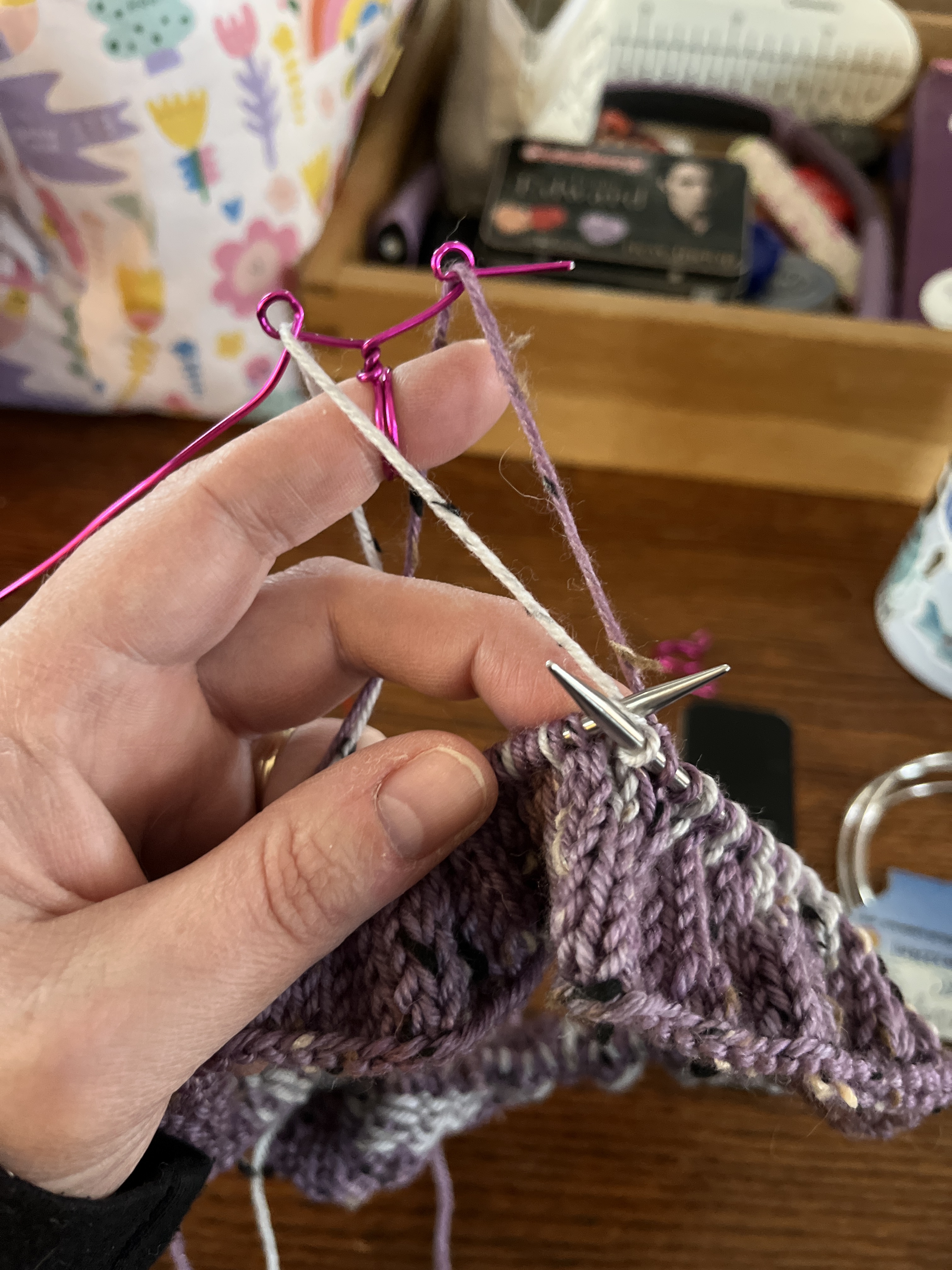 I’m so in awe of all you cool people who can knit beautiful color work projects, seriously. Color work is (was?) one of my goals for the year, and I’m trying, but let me tell you, it’s hard. You know that. I know you know that because you had to learn it once upon a time too. I started by holding the yarns in one hand, but that didn’t work, so I tried with the yarns in two hands, and it kind of worked, even if it was slow as molasses, but then my tension was forked up and way too tight so I had to frog four rounds of color work and start over.