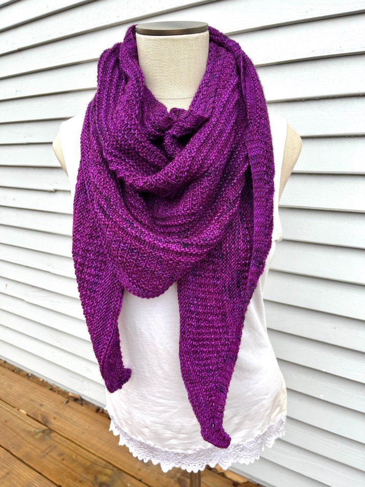 Even though knitting hasn’t been quite as joyful for me lately, I’m still trucking along on several projects. I cast on my second Turtle Dove II, with the peacock yarn, but it’s hibernating in the early stages of the yoke increases. I’ve got a bright turquoise fingering weight lace cowl going, but it’s very meh for me. I’ll finish it at some point. I did finish a shawl with two skeins of MadTosh Pashmina, which is a yummy blend of merino, silk and cashmere, in a stunning color called Wino Forever that’s impossible for me to truly capture in a photo, but maybe you’ll get some idea.