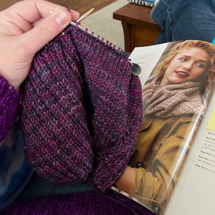 The pattern is called the Anomalie Shawl (non-Rav link), which is a crescent shape built of alternating ribbing and garter sections. It was wonderful to knit, both yarn and pattern, but didn’t end up quite as big as I’d hoped, even with using two skeins. I also finished the Chai Latte cowl, which I have in a book called Coffee House Knits but is also available online (non-Rav link). It’s currently blocking but here’s how it looked in progress. The yarn is Malabrigo Rios in Purpuras.