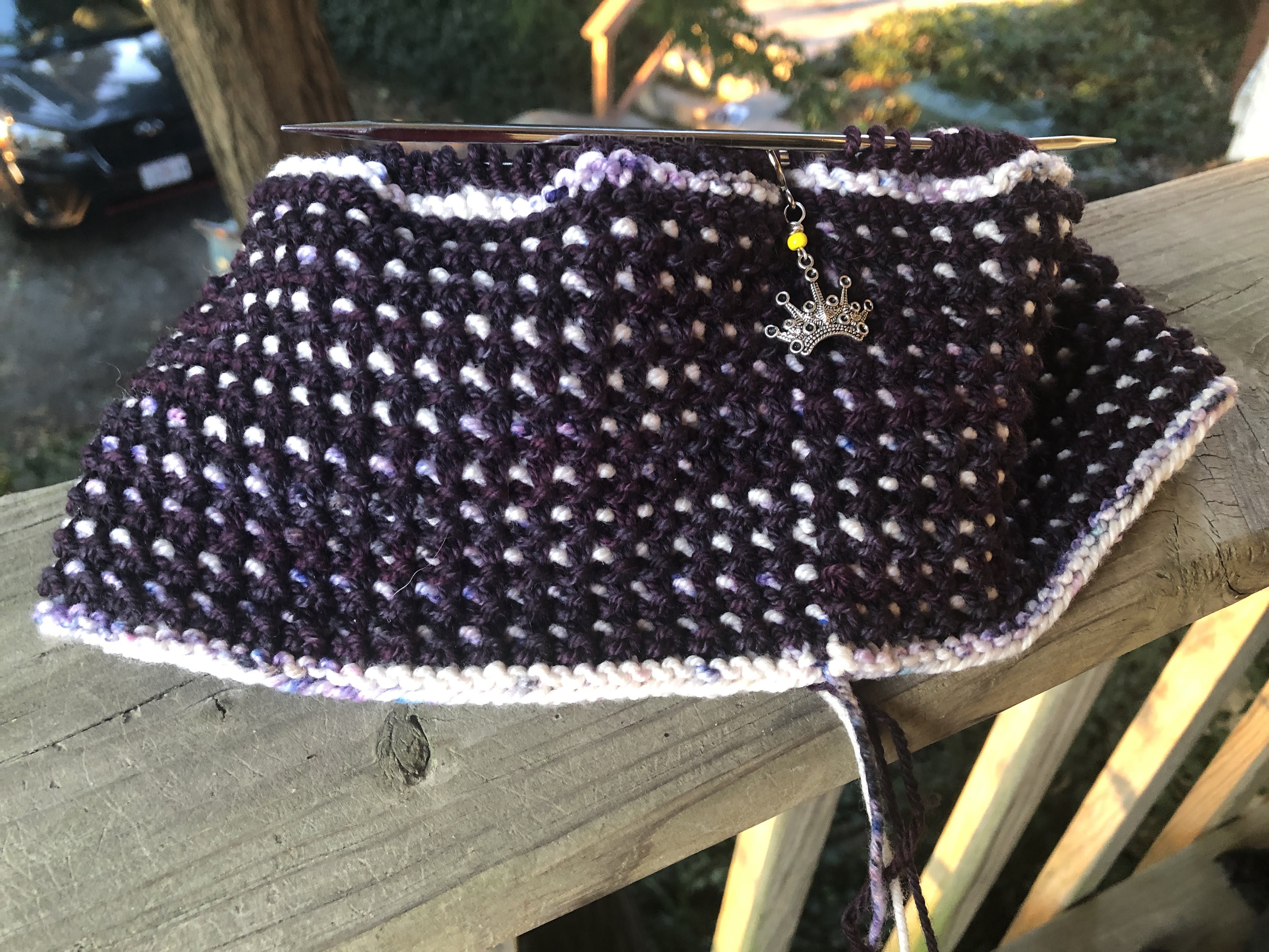 I knit this as part of a knit-along run by my favorite LYS, Yarn Social, so of course I got my yarn there. The dark purple is Neighborhood Fiber Co. Studio DK in Park Heights, and the lighter speckled one is Primrose Yarn’s Jasper in Milky Way. They were perfect, exactly what I wanted. The Primrose had just enough of the dark purple speckles to blend but still pop. And they were both great to knit with, thick and squishy. The mosaic knitting, since it’s all slipped stitches, makes a really dense fabric. I don’t think the wind will get through this!