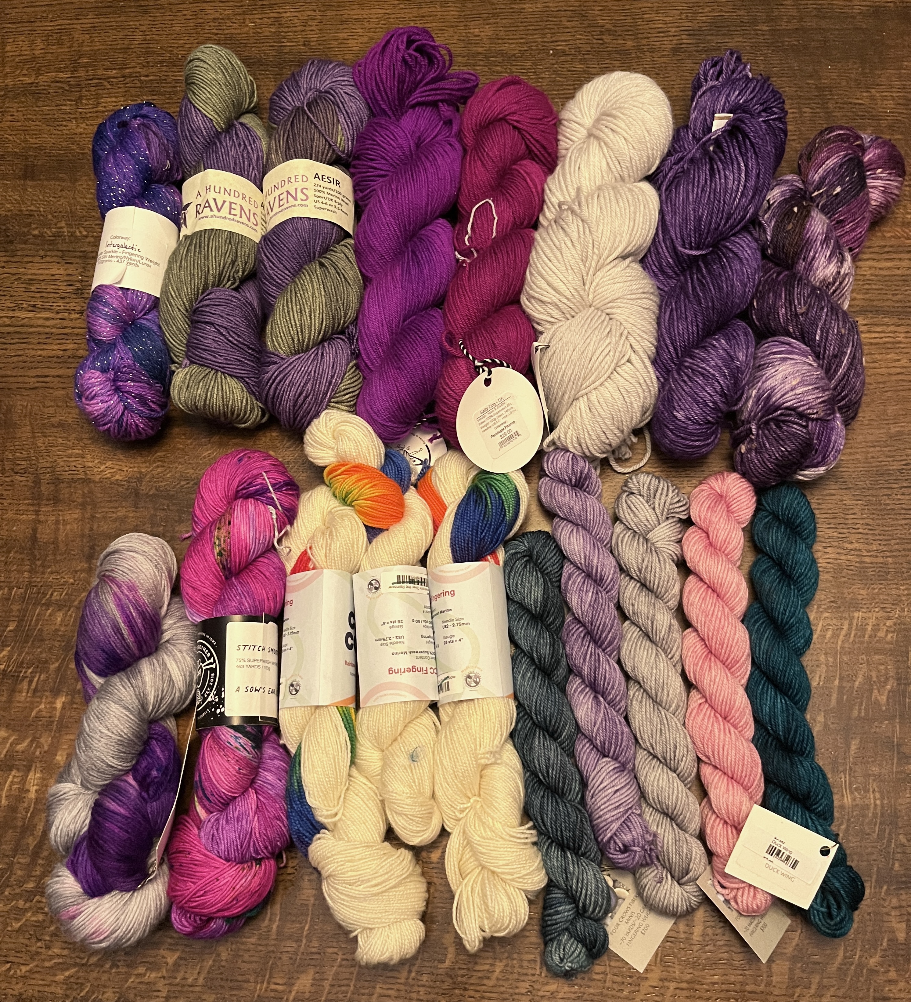 I got to pet sheep and go to a bookstore and a yarn store (The Sow’s Ear is SO GOOD!!) and the yarn I came home with is amazing. It’s a good thing we don’t do this very often! Some things were gifts though — I got a specially-dyed skein of yarn plus a gorgeous project bag from Chestnut Hills Farm & Fiber that I adore.