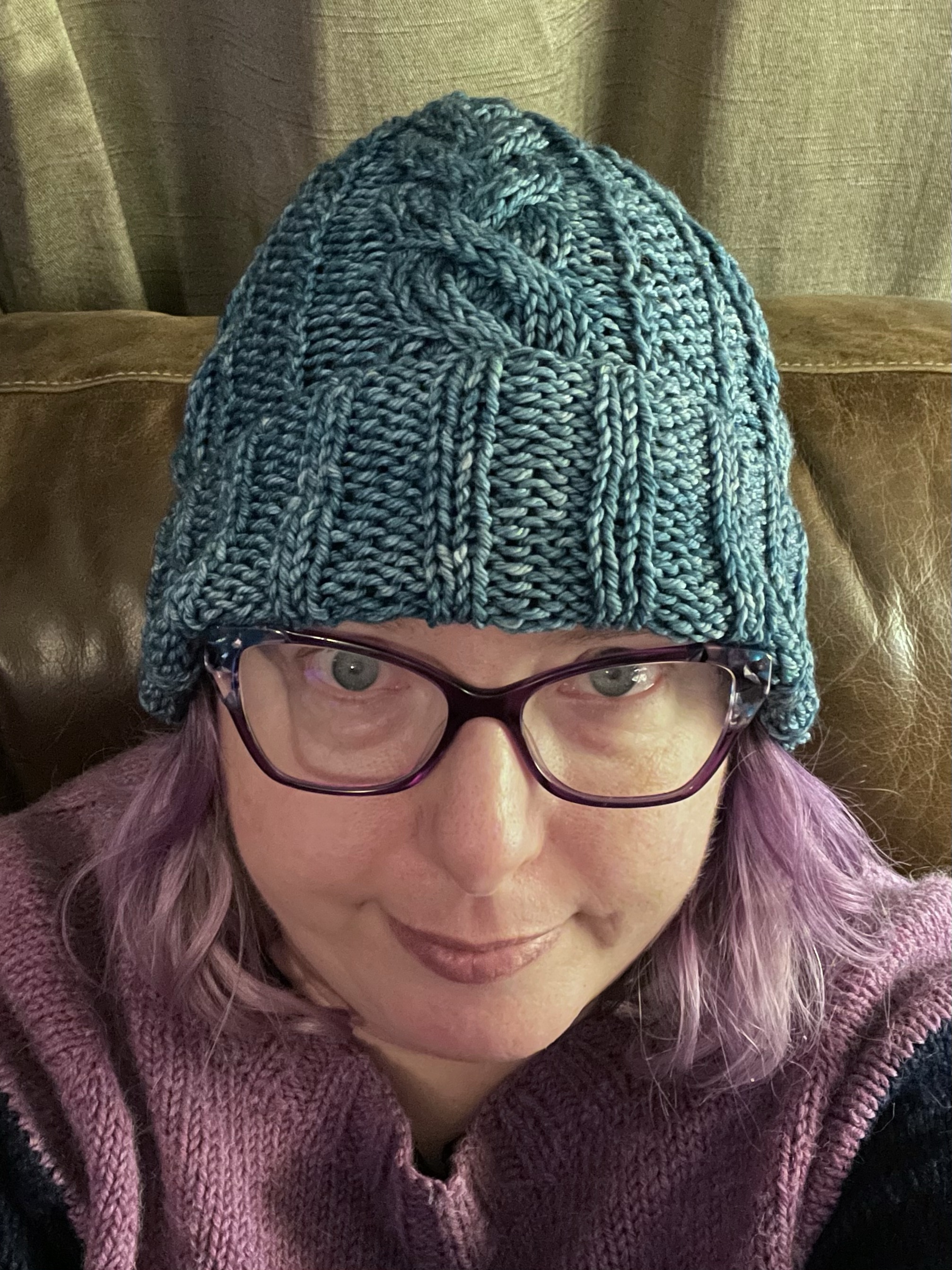 My cable-novice brain is suggesting that I must have done a back cable as a front, see down there by the brim? But then the rest of the hat is good and it fits well and it will be colorful and cozy… if I ever need to go outside in these crazy single-digit temperatures.