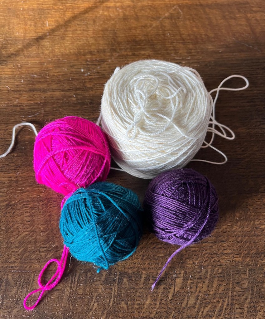 The cream and black were both leftover partial skeins from stash so I’m thrilled to use them up. The black (actually charcoal) is a merino/silk blend from Julie Spins and the cream is Malabrigo Sock. The pink I bought for this project and it’s Baah Yarn La Jolla in Pink Tourmaline. I’ve got about 57 grams left of the pink so it might work well paired with a multi-colored yarn in a bigger shawl. I loved working with it – it’s so nice and crisp.