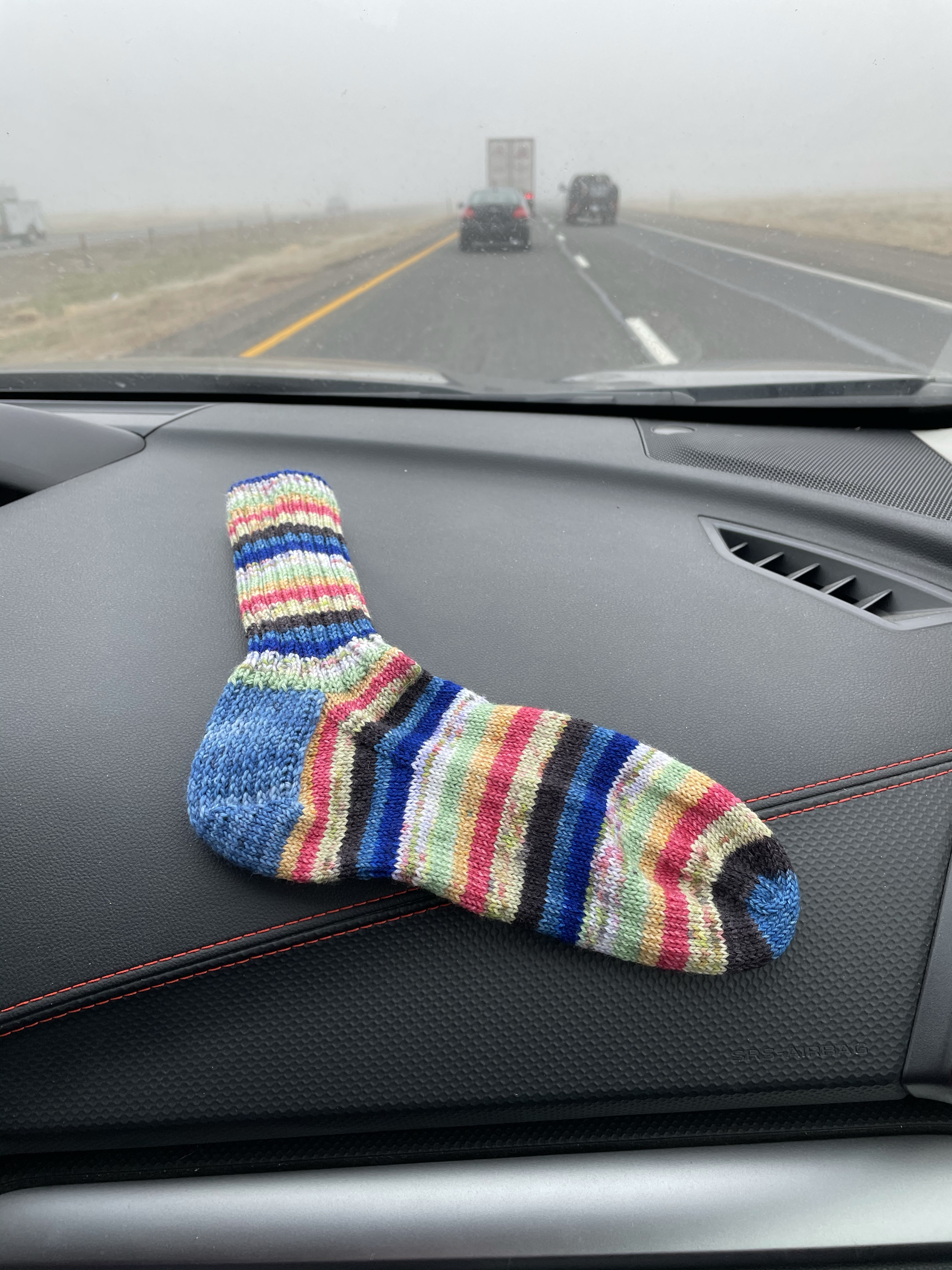 The completed pair used a skein of speckled purple from Mothy & the Squid and I LOVE her yarn. Wish she wasn’t overseas! The shawl is my Peacock’s Tail, a fun one-skein project that might have used a yarn from Blissful Knits. (Keeping track of yarns used is not a high priority at the moment, sorry.) The single sock was started last weekend as the husband and I took off for an anniversary weekend getaway (more on that another day). I got all but the toe done while we were gone, then it took me three more days to get around to the toe! I pulled a languishing skein of sock yarn from Colorful Eclectic Dyeworks from the stash for that one.