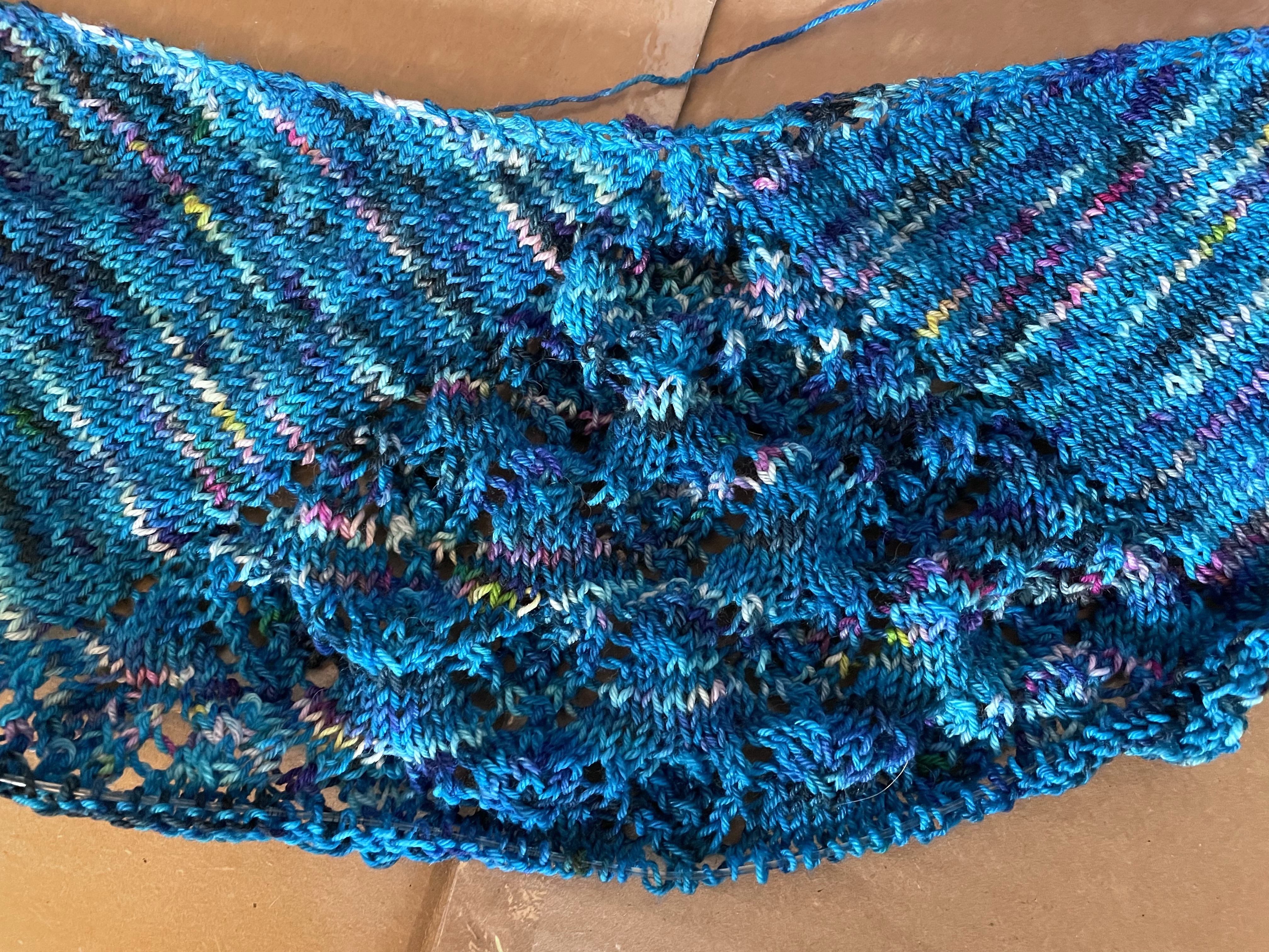 I had to frog 30 rows of lace on Saturday. 327 stitches per row. That’s over 9800 stitches, and it was only 15 rows from the end of the shawl. But I’d dropped a stitch a few rows back, thought I’d fixed it, then I dropped another stitch, thought I’d fixed it, my stitch count was off by one so I adjusted, and then the next row my stitch count was off by three. Upon further investigation, the diamond lace pattern was hecked up, to put it in technical terms. I hated to do it but I want this to be a good shawl, thus, the frogging. I got all my stitches back on the needle safely and have done three rows correctly. Now I’m just trying to decide how often to move my lifeline now!