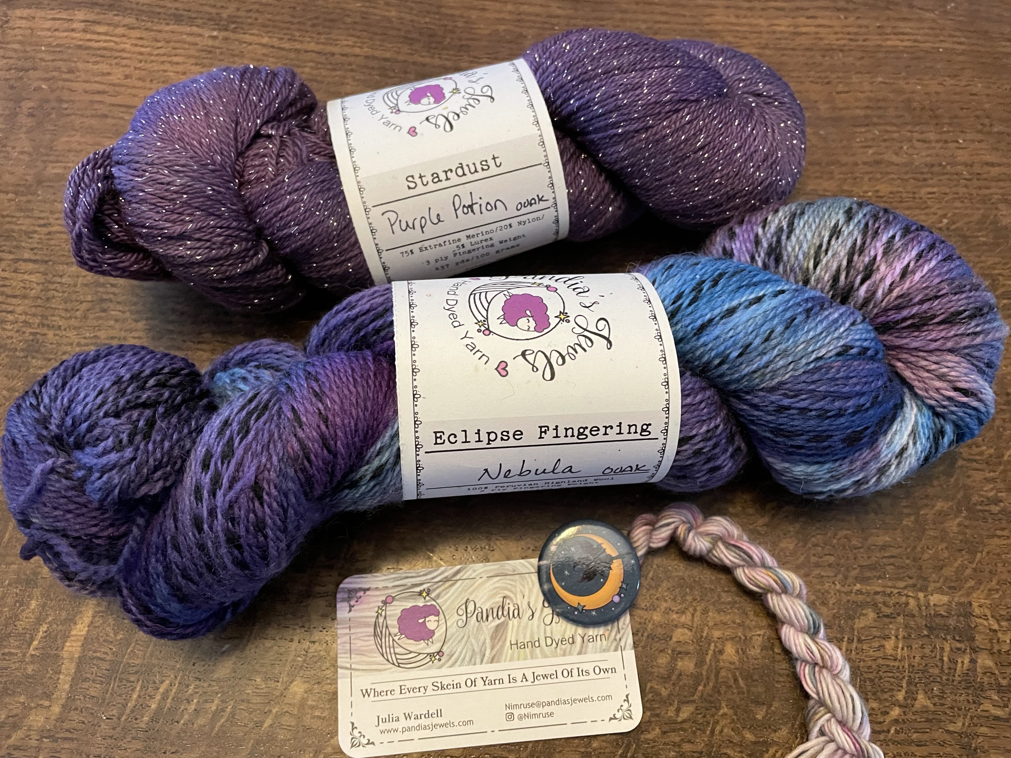 I think I’m through four of nine 12-row pattern repeats, so almost halfway. I might spend more time with this one over the weekend, because a lightweight silk cowl might be just the thing I need for spring. Two other happy things from yesterday: some absolutely gorgeous yarn from Pandia’s Jewels arrived and I have no idea what they’ll become except maybe just happy desk decorations for a while, and I got more purple back in my hair. I’d been taking a break from the Overtone purple conditioner for a while, mostly to see what my natural hair is like at the moment. Well. It’s rather dull with 2-3 inches of bleached hair at the ends. It’s fine, it’s good hair, I like the little silver hairs I have. The real problem is that it wasn’t purple, honestly. So the “purple for brown hair” came off my shelf and into the hair and it makes me happier when I look in the mirror.