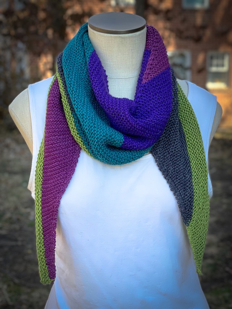 I did run out of the middle variegated color almost halfway through the last row, but I just finished with the solid blue and it’s fine. I love how all the colors play together, and I intentionally started with the blue since it’s a better color near my face than the fuchsia.