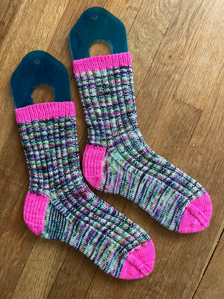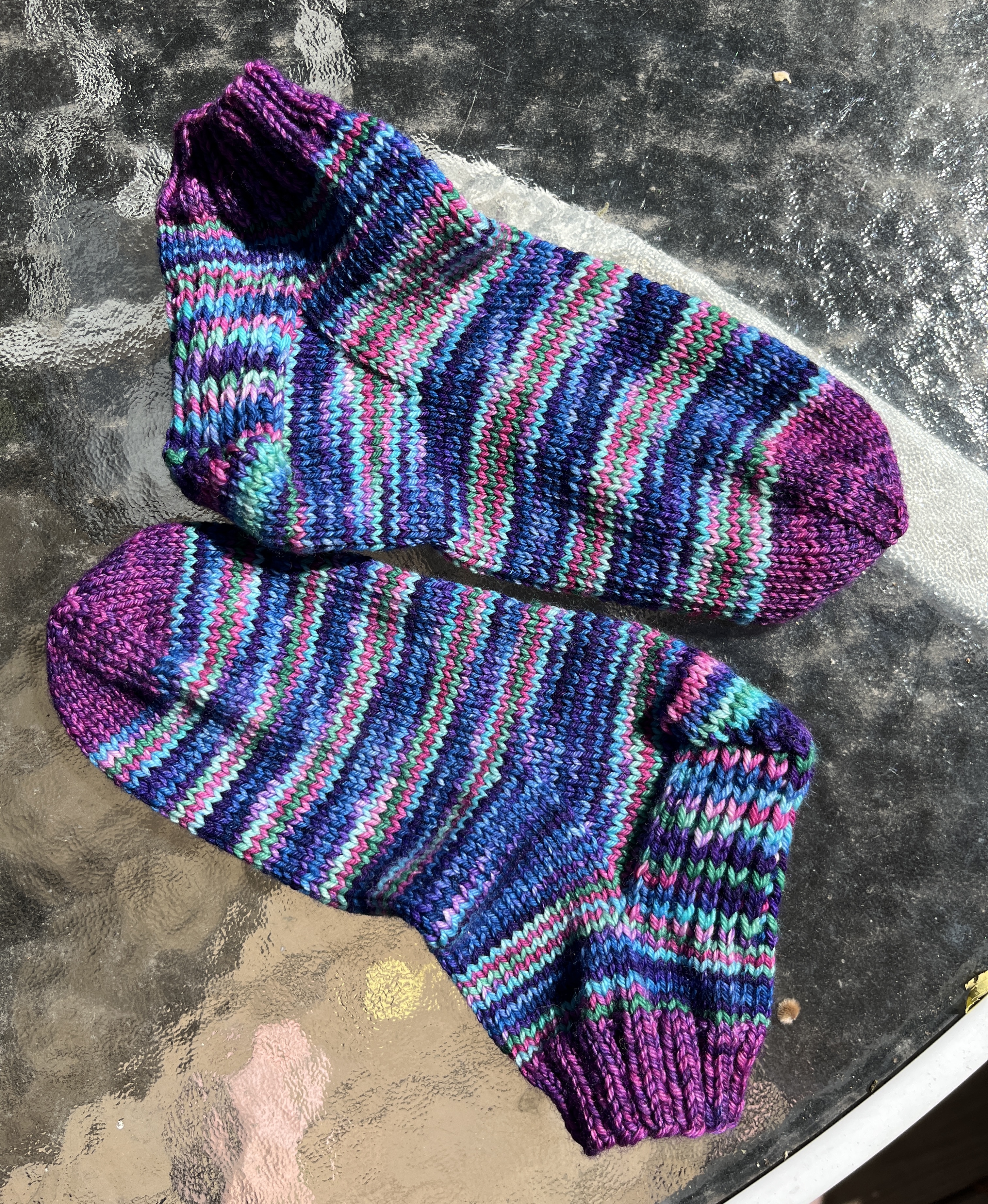 Here’s the thing: when you have a bunch of WIPs and you spread your knitting time around all of them (or at least some of them), then it takes a while for things to get finished. These socks, for example. I cast on in JANUARY and I just finished them, six months later. And they’re not even what they were supposed to be to begin with!
