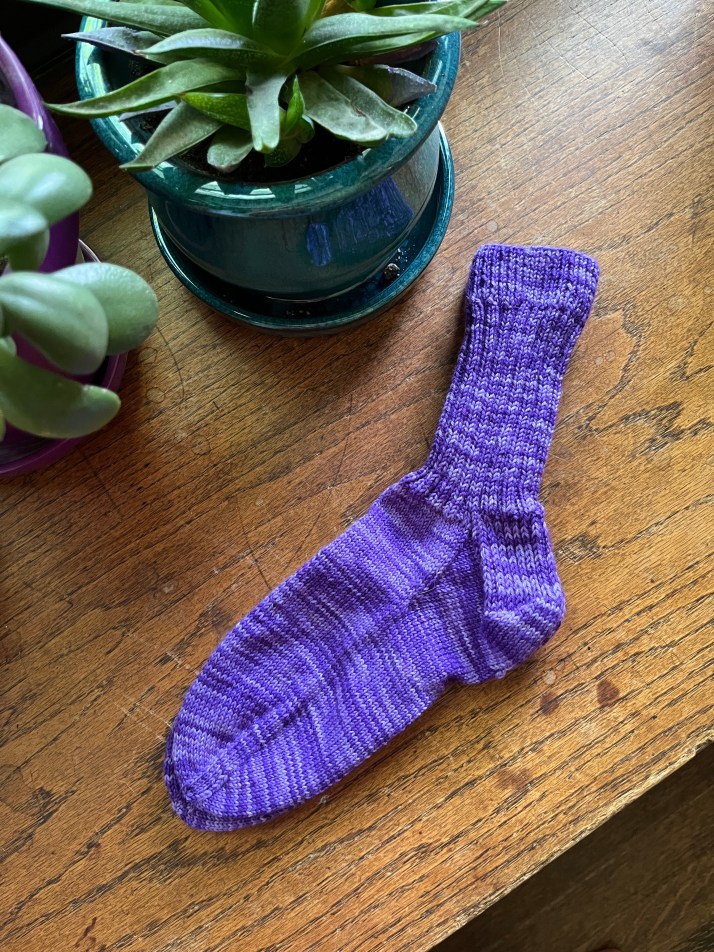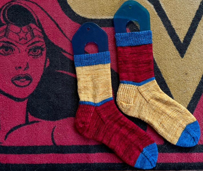 Originally, I had plans to knit these really cool Diana Prince (Wonder Woman) socks (pattern on Rav). It had the WW logo on the leg, but not only was the stitch pattern just charted and not written out (I don’t love charts – I usually find them harder/slower to read) but there was some weird fancy twisted stitch that looked super complicated and I just decided this pattern was more work than I wanted to do for a pair of socks. I like happy simple sock knitting. Of course, finishing these socks still took a few months after deciding that, but they’re done now and that’s the important thing.