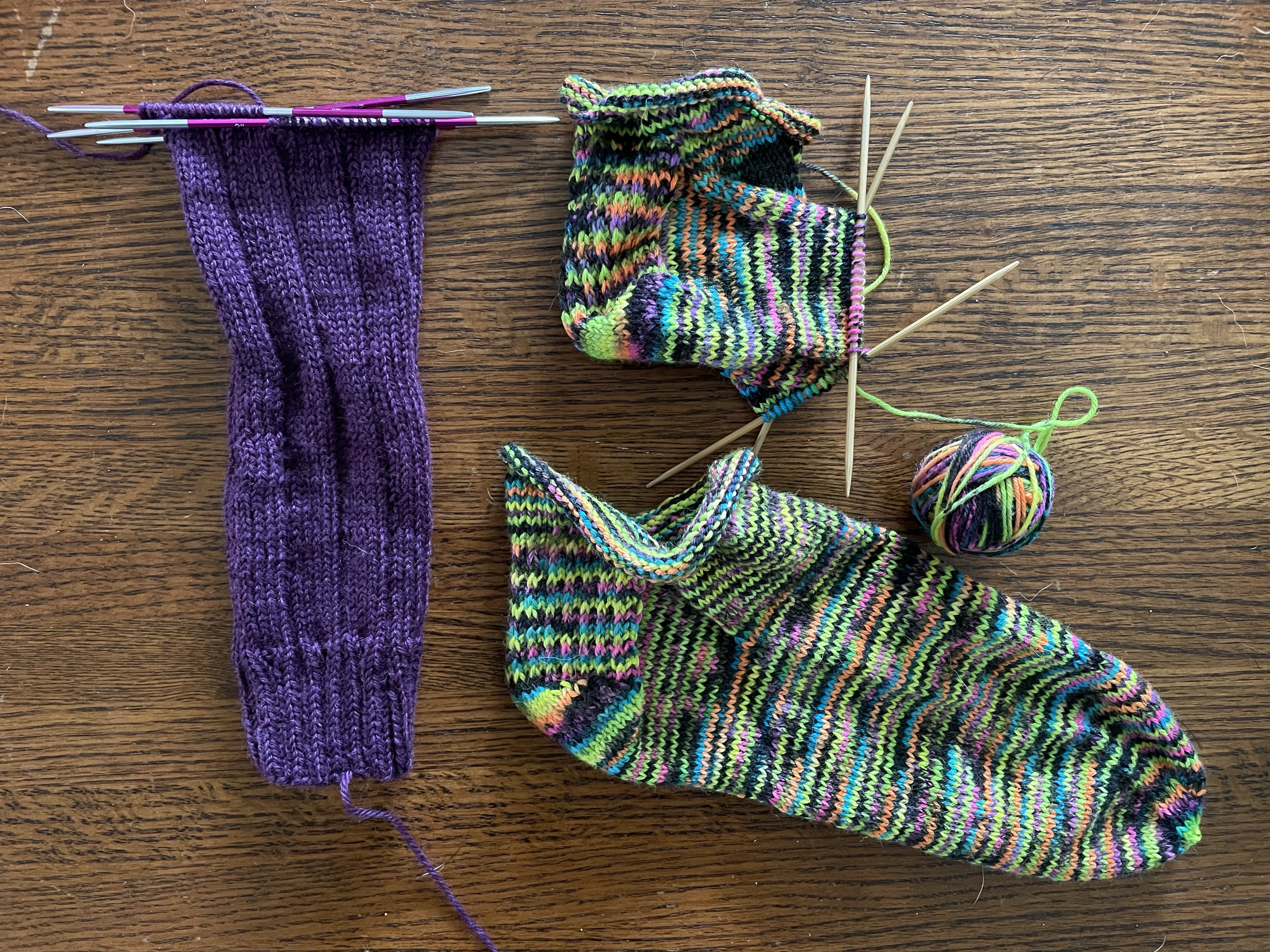 The completed pair used a skein of speckled purple from Mothy & the Squid and I LOVE her yarn. Wish she wasn’t overseas! The shawl is my Peacock’s Tail, a fun one-skein project that might have used a yarn from Blissful Knits. (Keeping track of yarns used is not a high priority at the moment, sorry.) The single sock was started last weekend as the husband and I took off for an anniversary weekend getaway (more on that another day). I got all but the toe done while we were gone, then it took me three more days to get around to the toe! I pulled a languishing skein of sock yarn from Colorful Eclectic Dyeworks from the stash for that one.