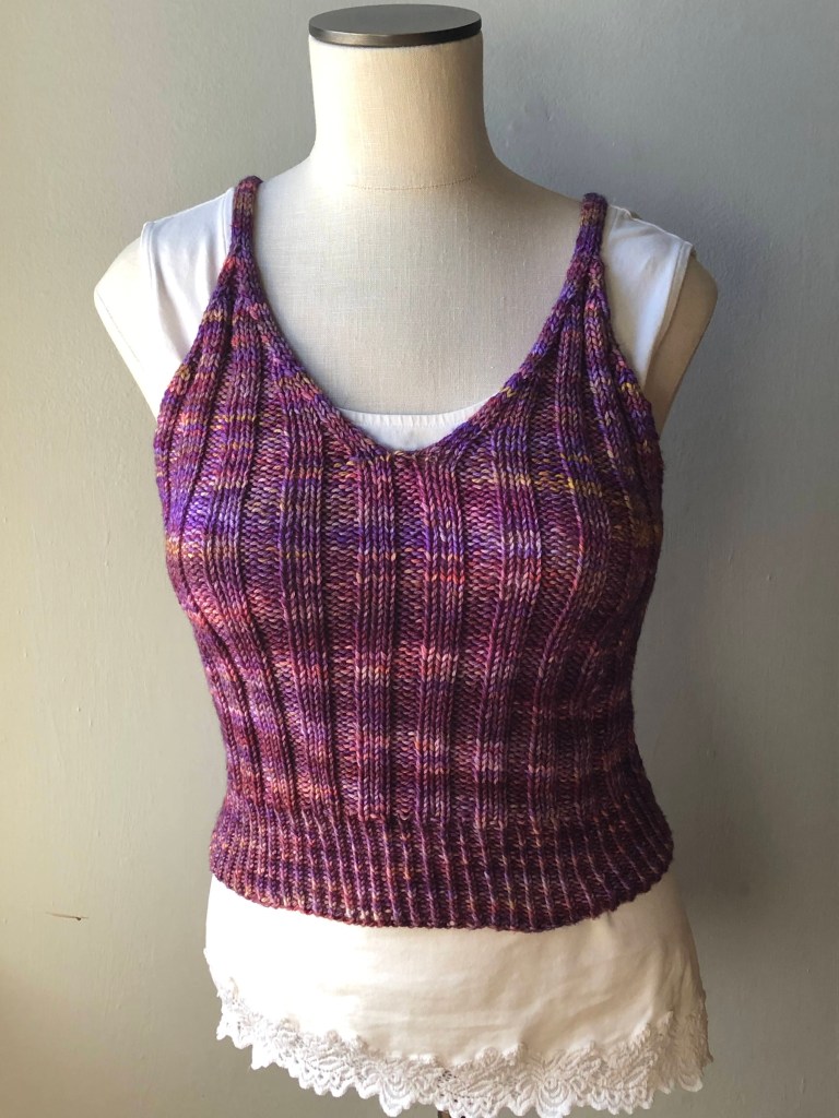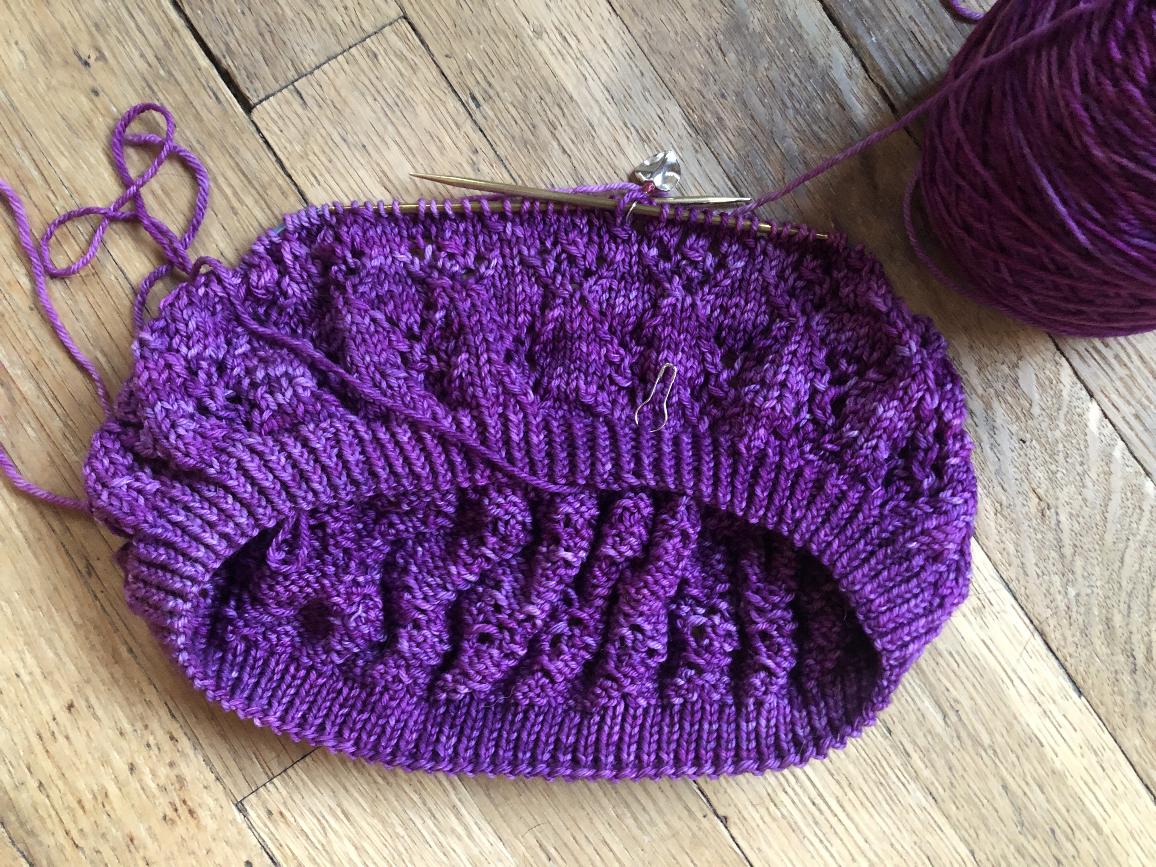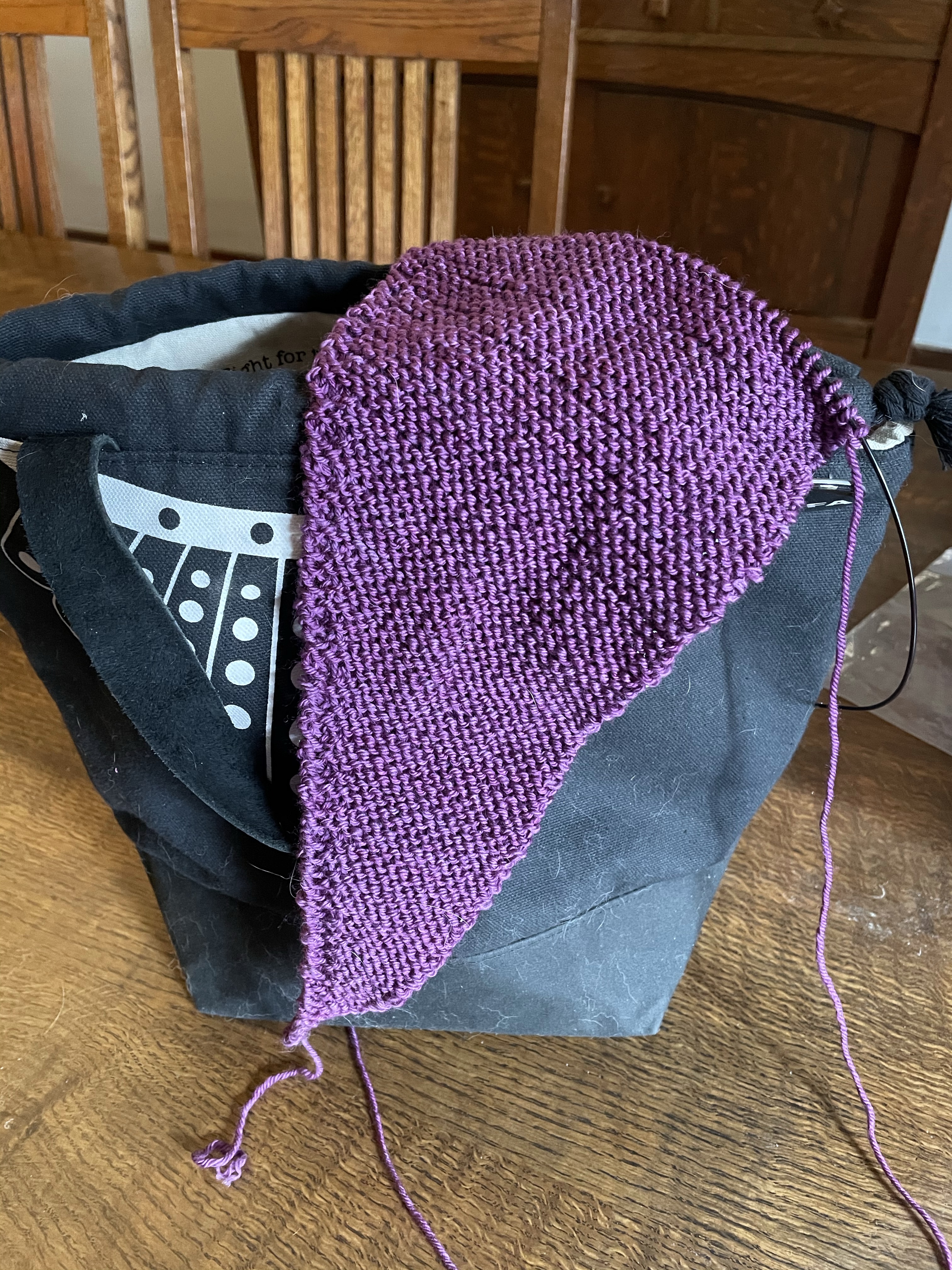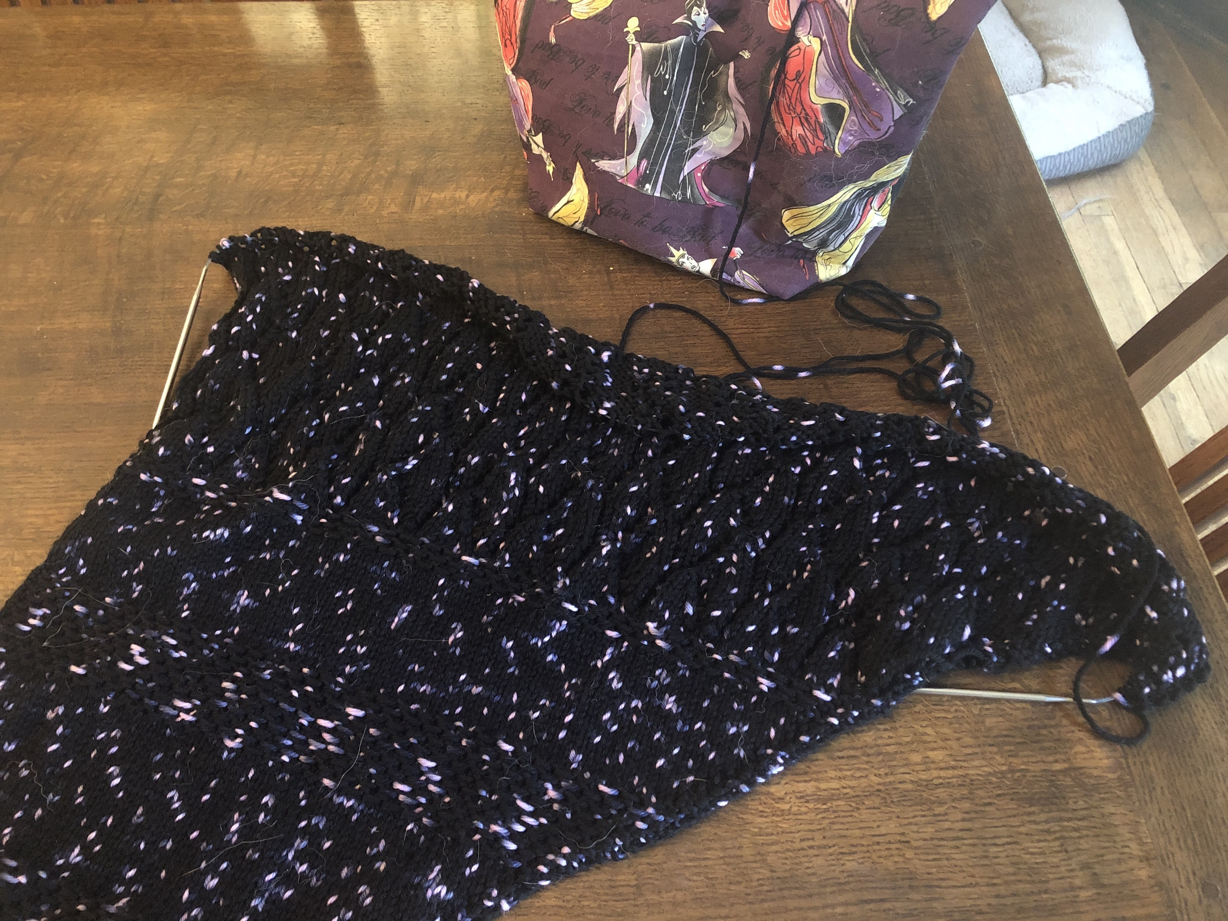 I just started color four of five and it still seems a bit … mini? I’m really hoping it blocks out to a wearable length. If it does, this is a pretty good pattern for minis, because the small size is marked by percentages. Since I have five skeins, I just marked the rows at 20% increments. But when I got to that first 20%, I still had some color A left, so I did a baby fade with alternating two rows of A and B. That meant I had even more of Color B left at 40%, and so on. Basically, it means that if I want to use as much of the last color (the pink) as possible, I’ll probably be adding in a few extra rows, which will mean guesstimating how many rows I can add without running out of yarn. We’ll see what happens. This shawl is very much a “what the heck” shawl. It’s full of mistakes and shrugs and “eh, it’ll be fine” moments. And I’ll never notice once it’s blocked and around my neck!