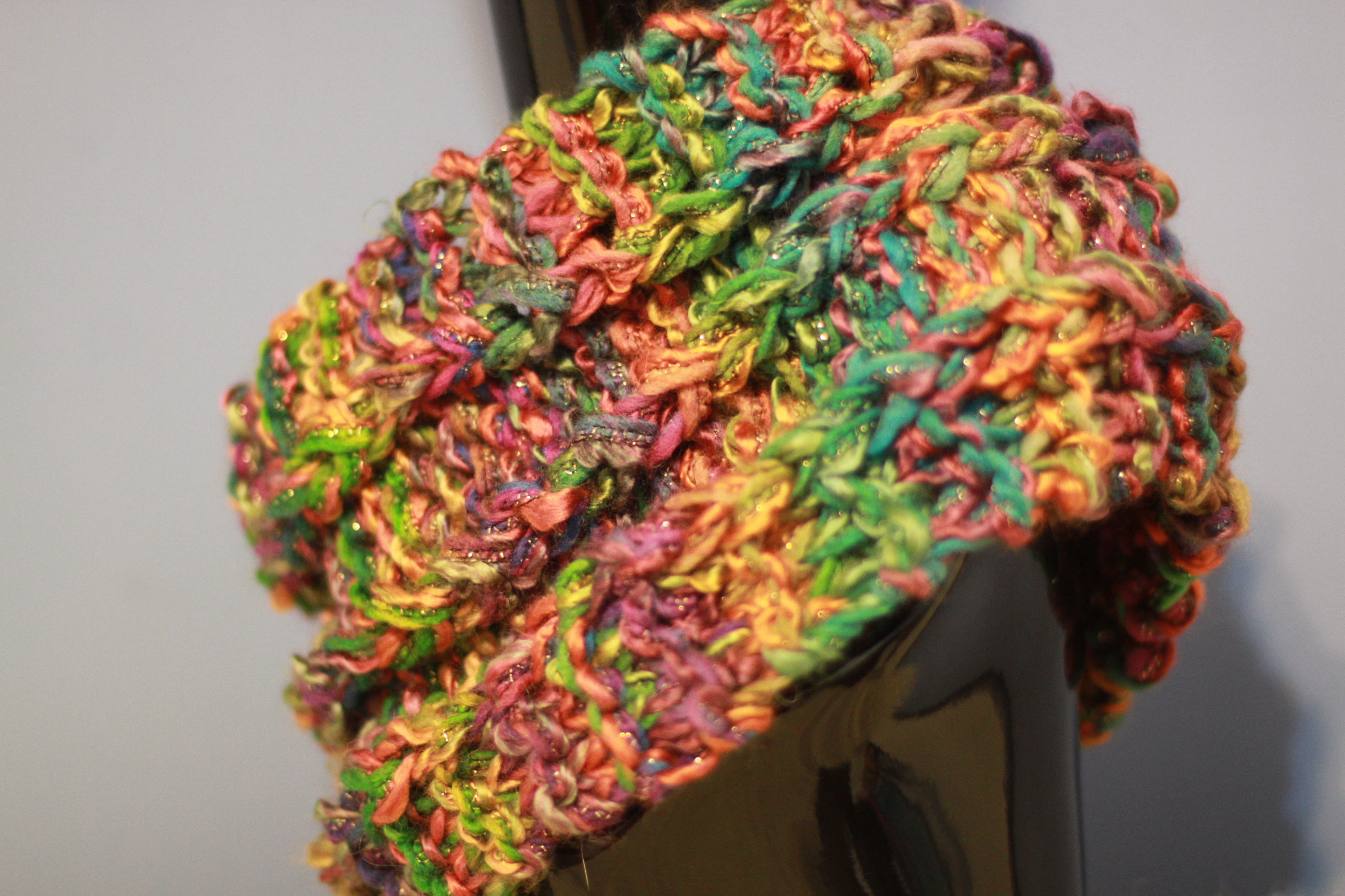 I couldn’t wait to use them, of course. I wound 5 or 6 balls of yarn first, just to play with my swift, then I poked through Ravelry for a cowl pattern using that size needle. And heck, who could resist something called the World’s Fastest Cowl? I’d been waiting for the right pattern to go with two balls of this super bulky Trendsetter Genie that I’d picked up at an estate sale. I do love my bulky multi-color yarns, you know.
