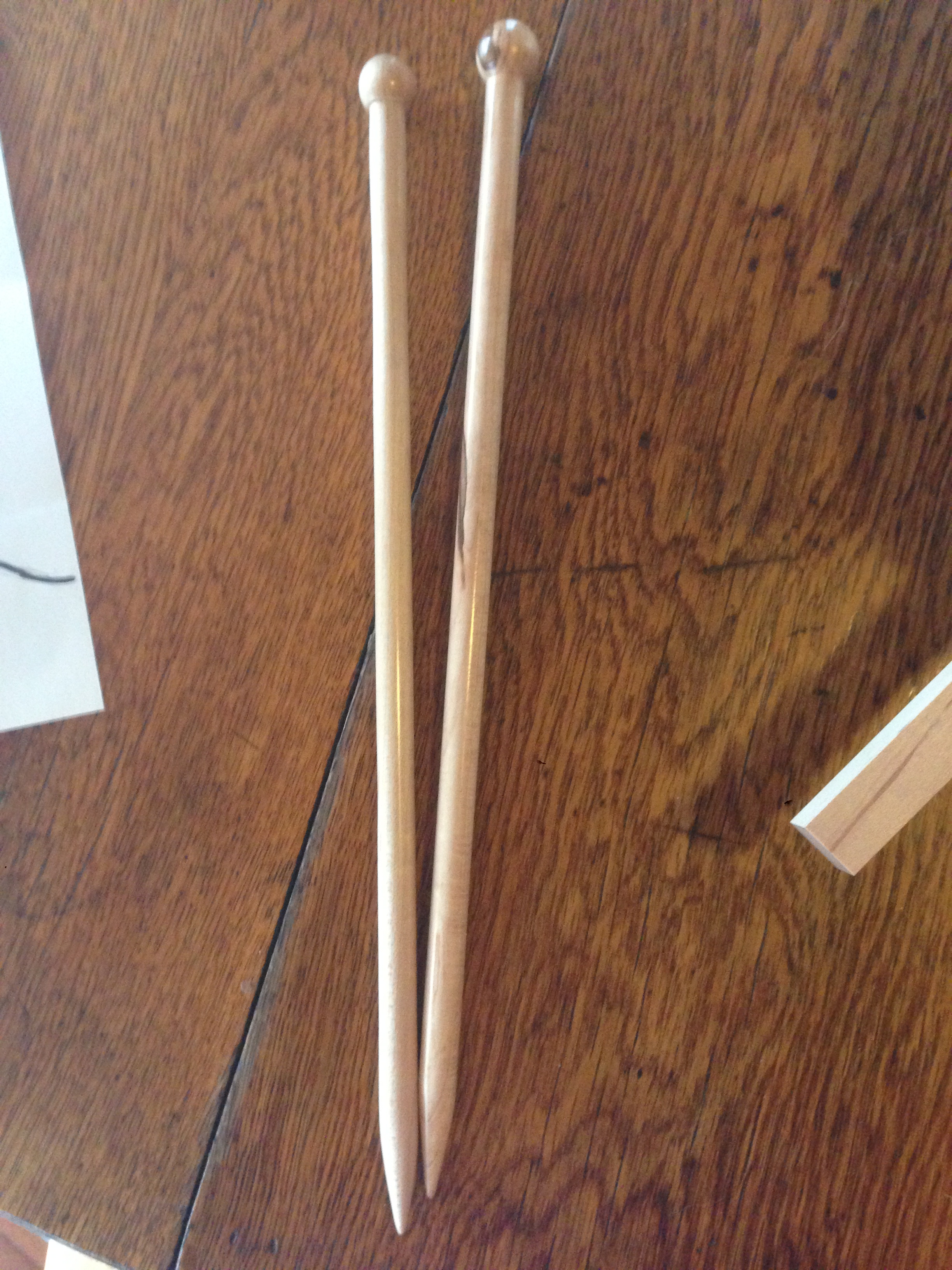 That, my friends, is my new swift. I saw it on Pinterest and have been bugging the hubby for one ever since, and finally he made one! I love it. It works wonderfully, and it can fold up for storage or moving. That’s not all though: he’s been experimenting with turning wood, and I received a beautiful set of maple knitting needles. They’re 14″, US size 17. A bit heavier than the bamboo I’ve worked with before, but that wasn’t a problem once I got used to it.